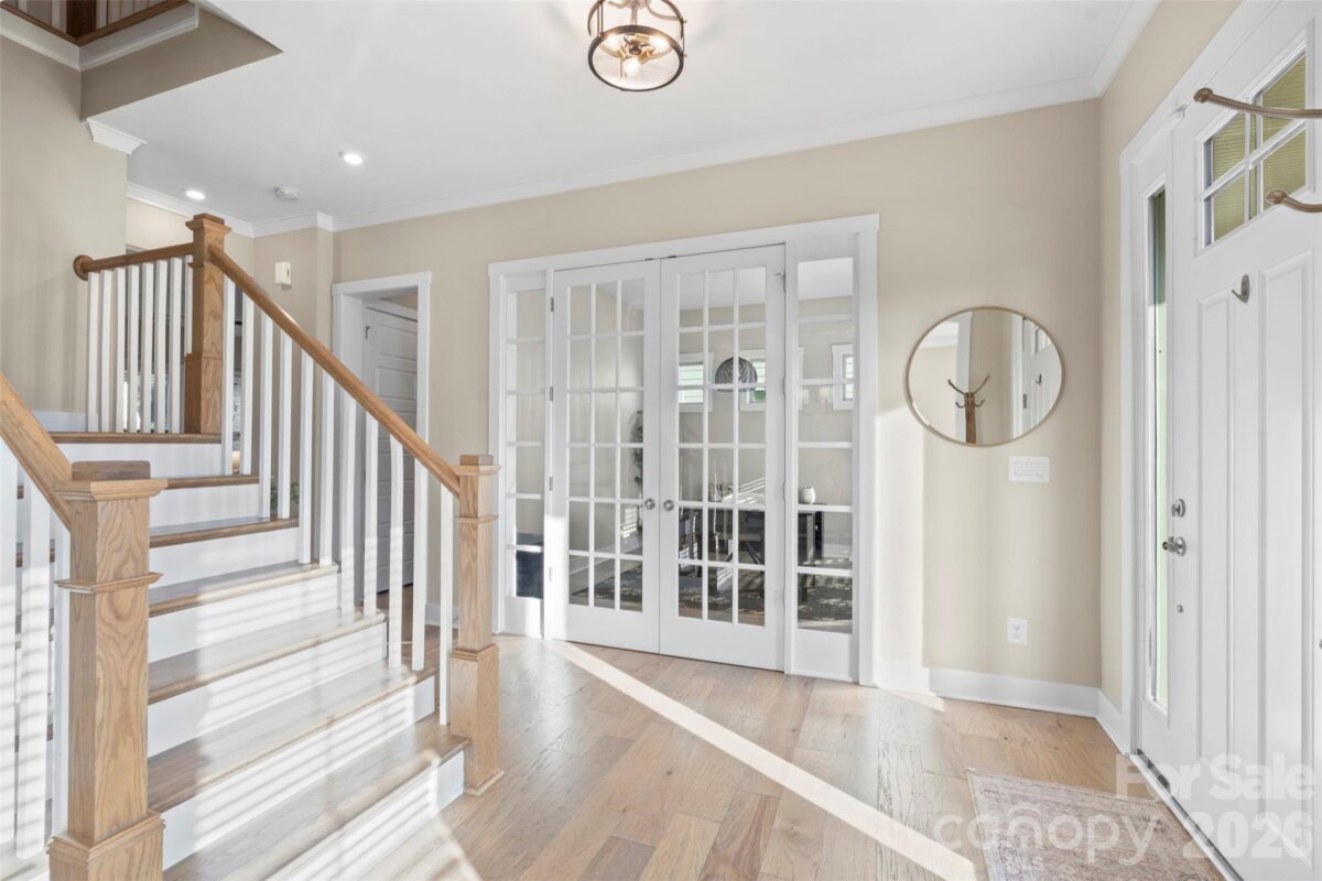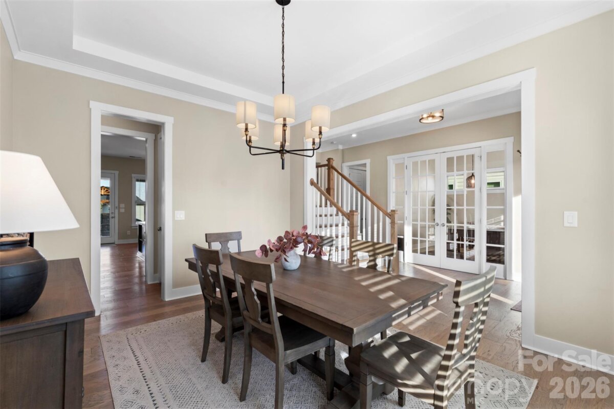 Elegant 4BR home with bonus room/bedroom and private office featuring French doors in the prestigious Paddlers Cove community. This beautifully appointed residence offers an open main level with luxury vinyl flooring, formal dining room with french doors, and an expansive great room with fireplace, ideal for refined entertaining and everyday comfort. The chef-inspired kitchen showcases quartz countertops, an oversized island, gas range with hood vent, and microwave. An oversized main-level laundry with storage, drop zone, and half bath add effortless convenience. Outdoor living is elevated with a covered back patio featuring a stone fireplace, extended patio, and fenced yard. The upper level offers four generously sized bedrooms, three full baths, and a versatile bonus room. Finished 2-car garage with parquet-style floor. Enjoy resort-style amenities including pickleball, tennis, outdoor pool, and baseball field. A must-see home offering elevated design, comfort, and lifestyle.