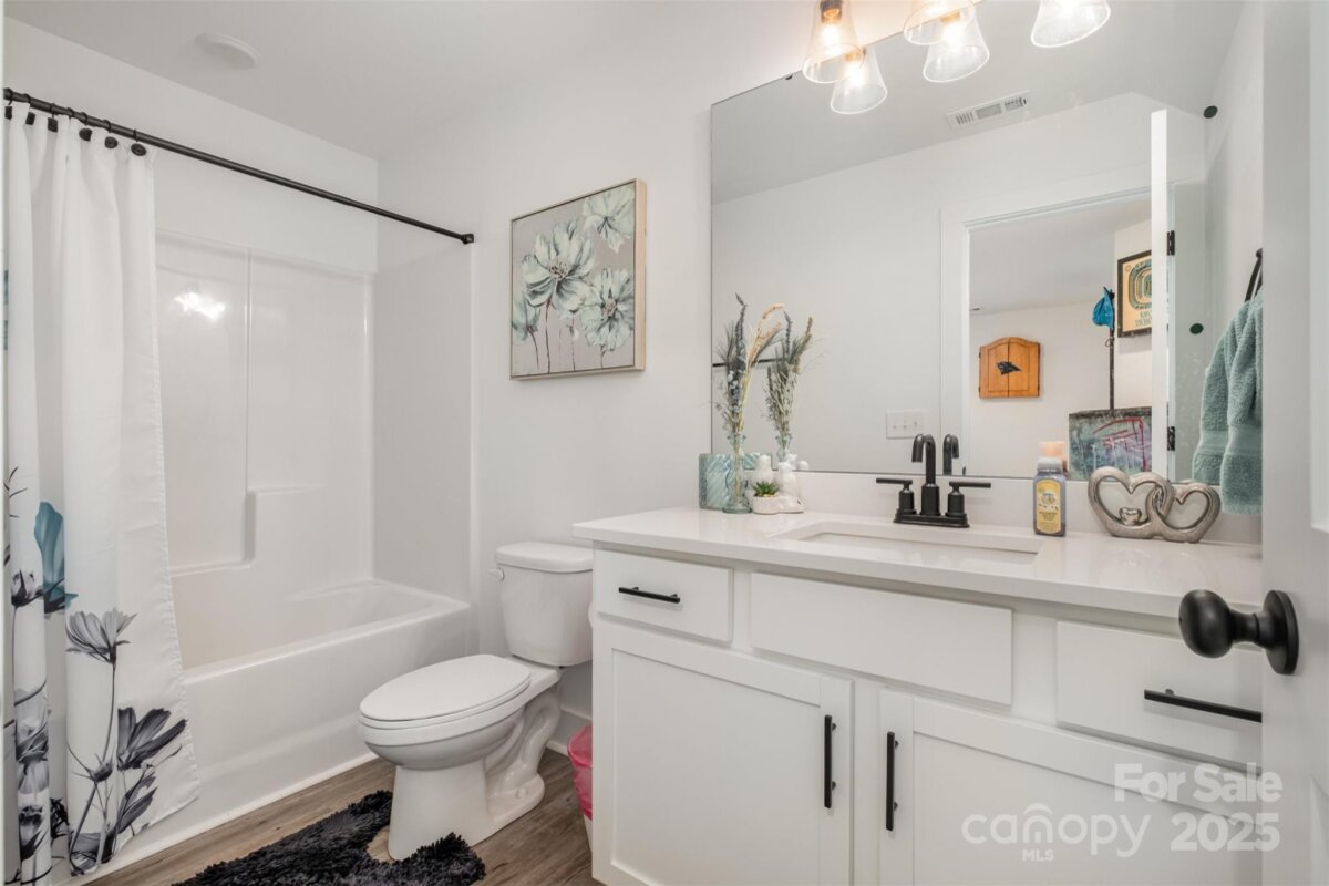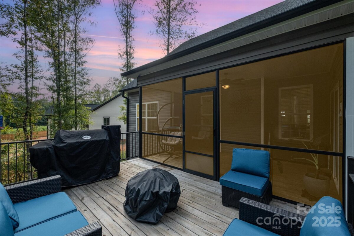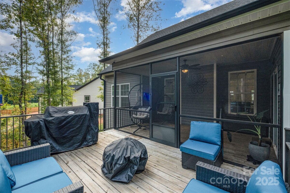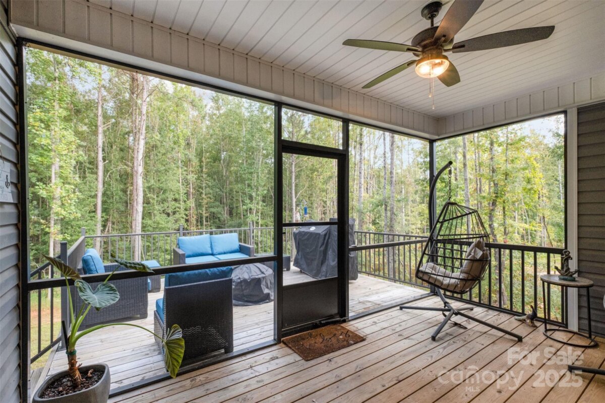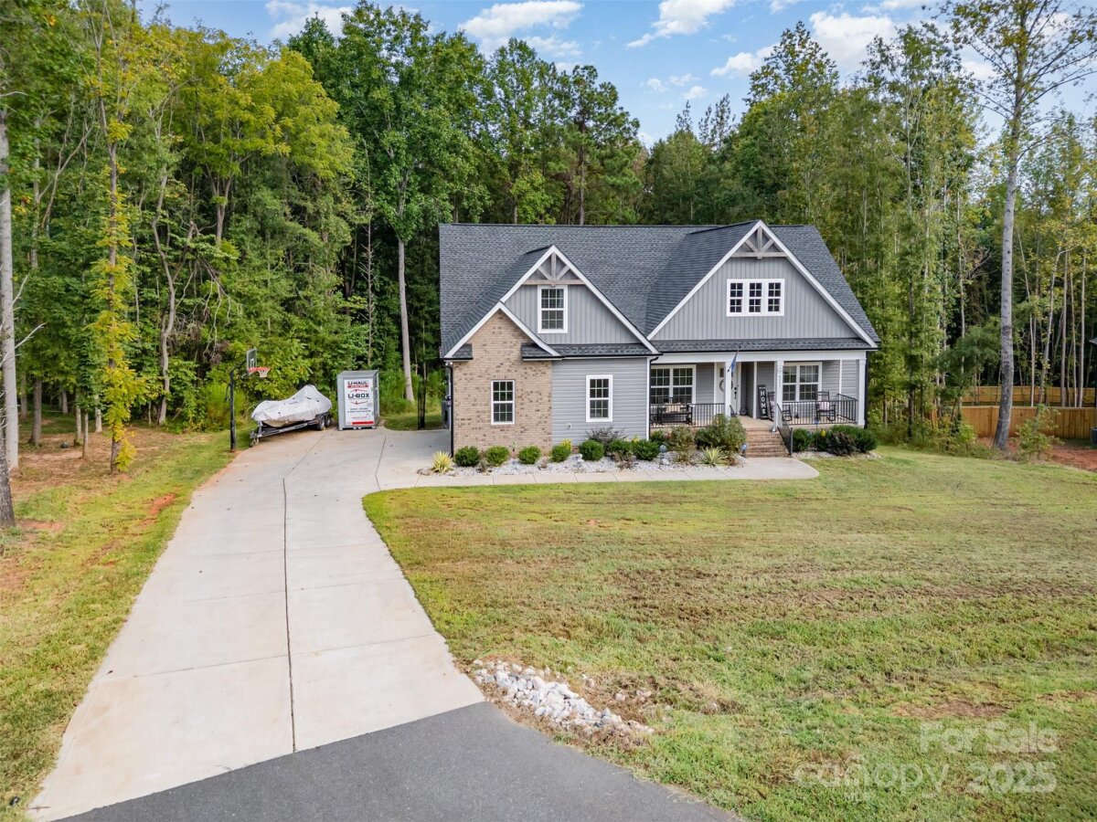 Tucked away in a quiet cul-de-sac, this beautiful home sits on a generous 1.21-acre lot in the highly desirable Sanders Landing community—part of the top-ranked Clover School District. Designed with comfort and style in mind, the home features a spacious primary suite on the main level, an open floor plan with a cozy fireplace, and elegant coffered ceilings in the living area. Enjoy peaceful wooded views from your screened-in porch, perfect for morning coffee or evening relaxation. Luxury touches abound, including luxury vinyl plank flooring, quartz countertops, and a tankless water heater for energy efficiency. A variety of unique ceiling designs add character throughout the home. Upstairs, you'll find a private bedroom with a full bath—ideal for guests—as well as a large media room perfect for movie nights, a home office, or play space. If you’re looking for privacy, space, and modern finishes in one of Clover’s best communities—this is the one!
