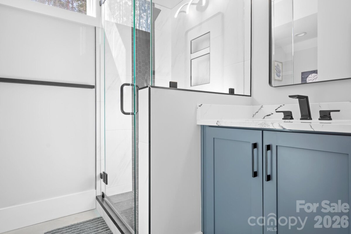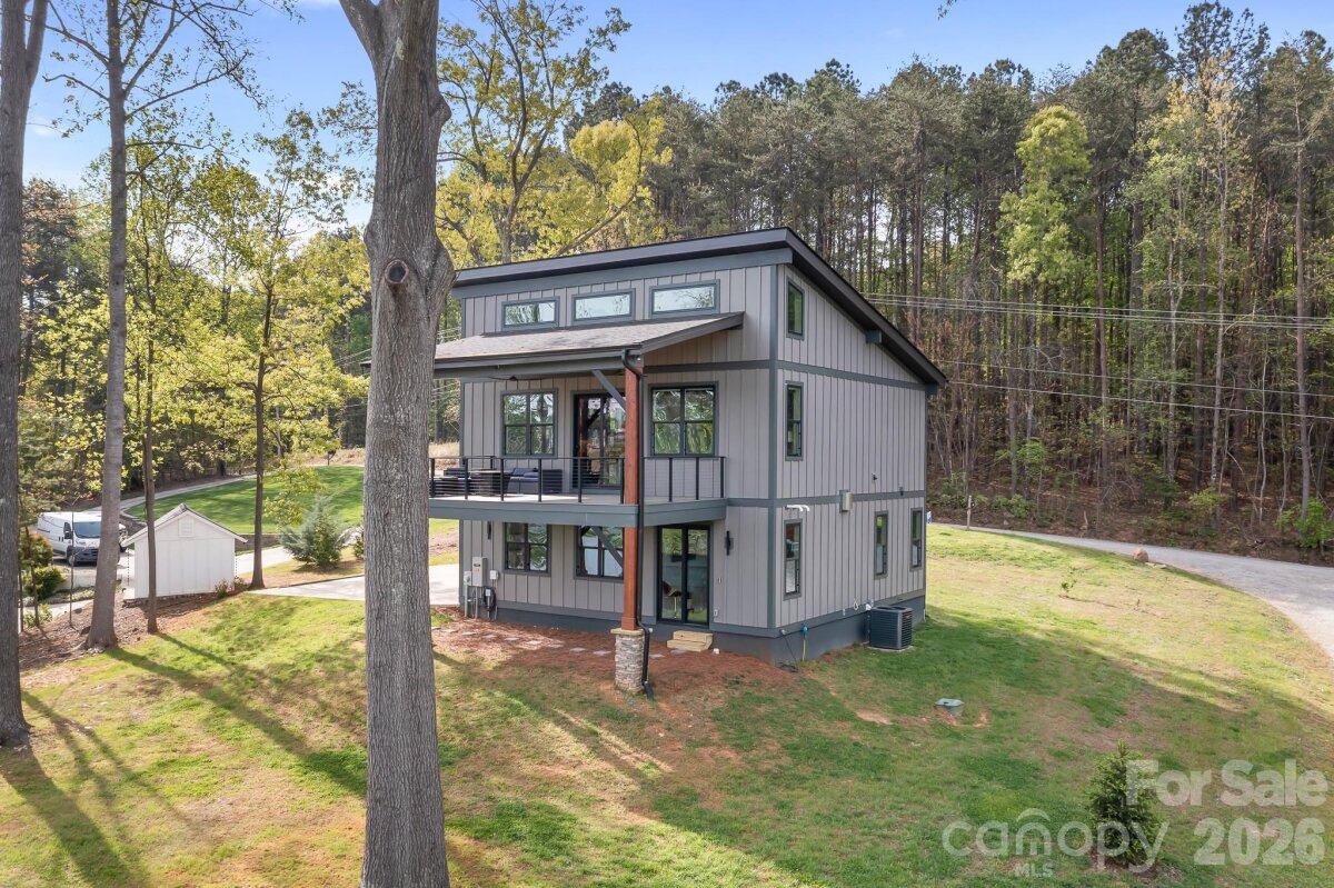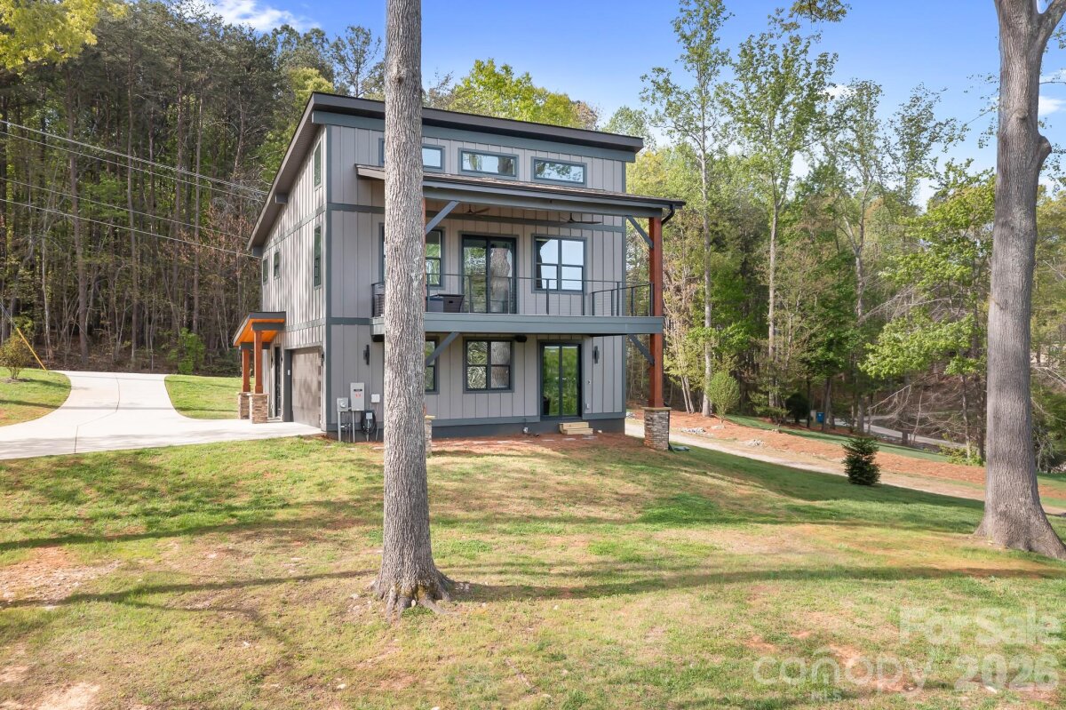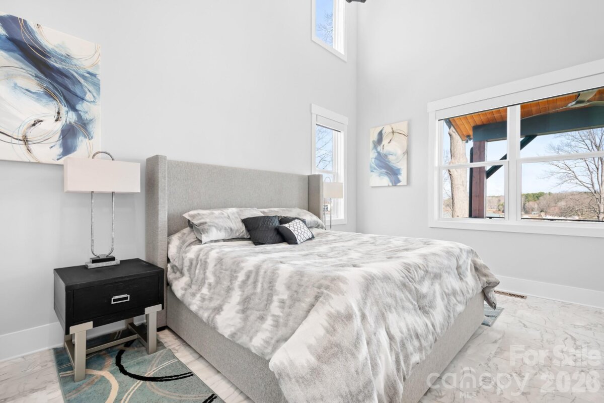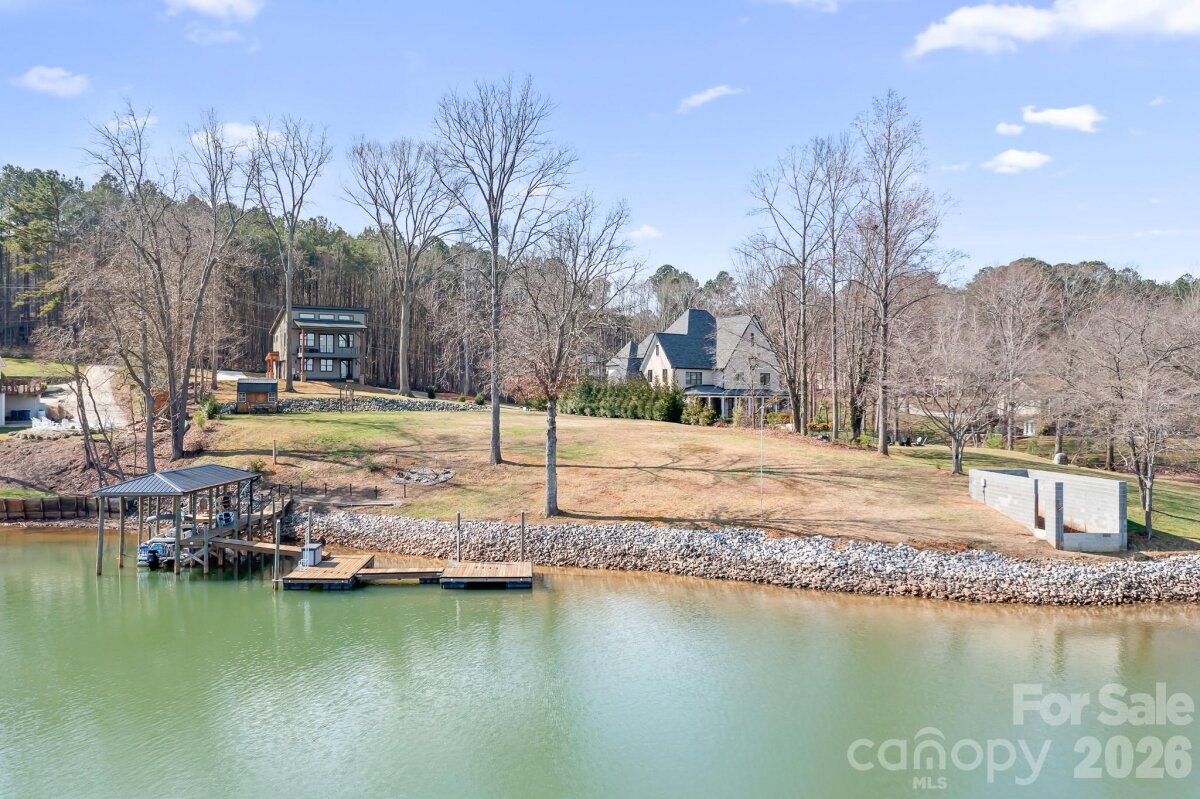 Price Improvement and ALL furnishings included for a turn key move in ready before the Memorial Holiday weekend and start living the Lake Norman life! Over 1 acre of Magnificent waterfront unrestricted land (NO HOA) with approx 217' of stabalized shoreline, a 40' covered fixed boatslip and additional floating dock. Build your future home while you live in the 2024 build secondary home with 2 bedrooms a dedicated office or you could use this as a 3rd bedroom and 2 car garage. No expense was spared during the construction. The complete Kitchen Aid appliance package, Additional holiday dishes can be stored in the hidden cabinets in front of the bar stools, Tankless propane water heater, Sono's sound system indoor and out, complete wifi home and wifi at the dock, Lake fed irrigation pump installed, Power at the dock for a future lift, Smart home wiring, Generator transfer switch installed, 30amp Electric car charger in the garage and so much more. You never have to worry if you have enough dock space for your friends and family. Enjoy every night sitting on your covered porch or on the covered dock with a seating area. Fall firepit nights with the peace and tranquility you have been searching for. Bring your own builder or have a chat with the builder that constructed this wonderful open floor plan contemporary home. Did we mention there is a former block boathouse that could be converted into a Jimmy Buffet style waterfront retreat. Long range waterfront views from the primary bedroom, great room, kitchen and home office. You can enjoy Lake Norman year round with deep water even when Duke energy brings the lake down during the winter months. You can realize what you have vizualized in your new construction home or just enjoy the current home and the lay of the level land. We've included a sample rendering of the primary home which was going to be constructed with the garage and front door on the street side with a wall of sliding glass doors for the bunk room, bathroom and hall. Basically flipping the garage level from back to front. To access the home office or could be used as a 3rd bedroom, enter throught the garage. Magnificent Waterfront views from the sliding glass door. Maximum building footprint is 50 x 60