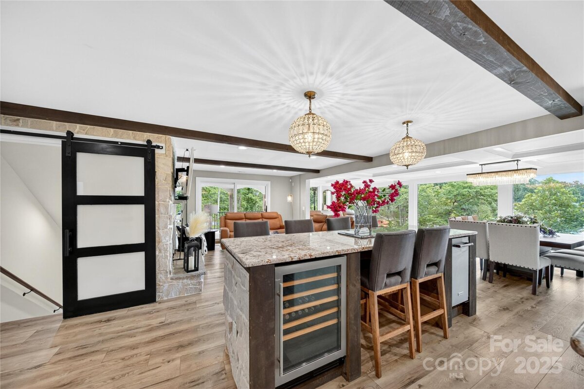 Modern, luxury A Frame on almost a 2-acre lot is a remarkable offering on Lake Norman with over 700 feet of pristine shoreline. A unique and showstopping waterfront estate was meticulously reconstructed in 2023—taken down to the foundation and rebuilt as the personal residence of a luxury homebuilder. This private retreat embodies timeless design, elevated living, and masterful craftsmanship. Perfect as a primary residence, second home, or investment property -with a successful short history as a high-end vacation rental, this property presents a rare opportunity to own an incomparable lakefront estate. Enter through a dramatic custom waterfall feature into a light-filled, open interior designed for both effortless entertaining and everyday indulgence. Every detail has been intentionally curated, including designer lighting, multiple fireplaces, elevator access to all levels, and top-tier appliances. The main-level primary suite provides a serene retreat with picturesque views of Lake Norman and direct access to the covered deck. The luxurious ensuite features an oversized tiled shower, a freestanding soaking tub, a spacious dual vanity, heated tile floors, and a large walk-in closet outfitted with a custom organizer. Additional bedrooms and laundry rooms on each floor provide optimal comfort and convenience. The outdoor environment is equally extraordinary, featuring a heated pool and spa surrounded by travertine, a gas fire pit, lush professional landscaping, architectural lighting, and an irrigation system. The newly updated 2024 dock and kayak launch offer effortless access to the water, perfectly enhancing the lakefront lifestyle. A detached three-car garage with an unfinished upper level, along with an expansive circular driveway and elegant porte cochere, completes this exceptional property.