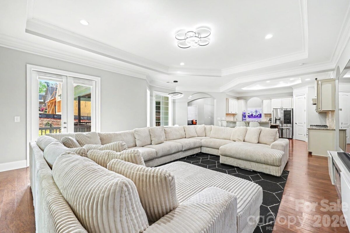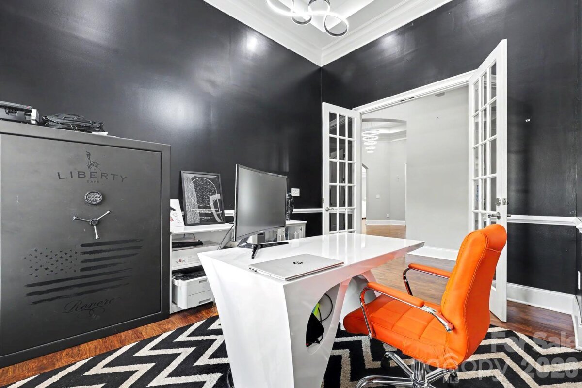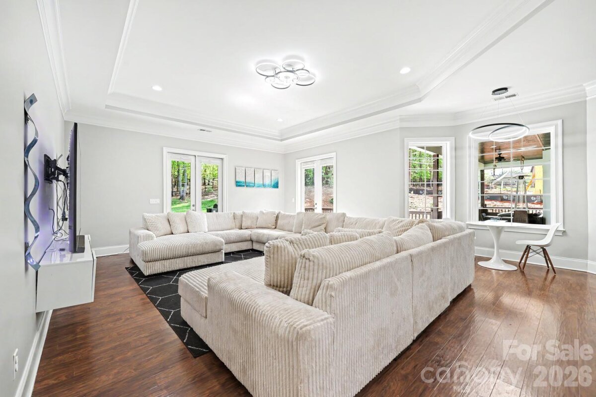 Exceptional custom-built one-story home blending luxury, comfort, and cutting-edge technology. Open floor plan showcases rich hardwood flooring, custom archways, and tray ceilings throughout main living areas. Formal living room features a stacked stone gas log fireplace, built-ins, and a striking 500-gallon mixed reef aquarium. Elegant dining room with picture frame molding is ideal for entertaining. Gourmet kitchen designed for the discerning chef with double ovens, gas range, granite countertops, tile backsplash, stainless appliances, and a large center island with prep sink—all open to the great room. Private primary suite offers a spa-like bath with dual vanities, makeup area, garden tub, and tiled shower. Split-bedroom layout includes three additional bedrooms, one with ensuite bath perfect for guests or multi-generational living. Outdoor living shines with an expansive deck, outdoor kitchen, and gas fire pit—perfect for relaxing or entertaining. Oversized 3-car garage with 20-ft ceilings, a 50 amp EV charger and a 10K lb lift ideal for car enthusiasts. Smart home system and whole-home automatic generator provide modern convenience and peace of mind. Located in a desirable community with gated boat storage and easy access to a public boat launch at Little Creek .2 miles away.