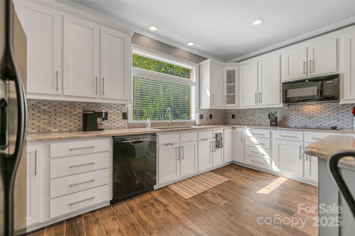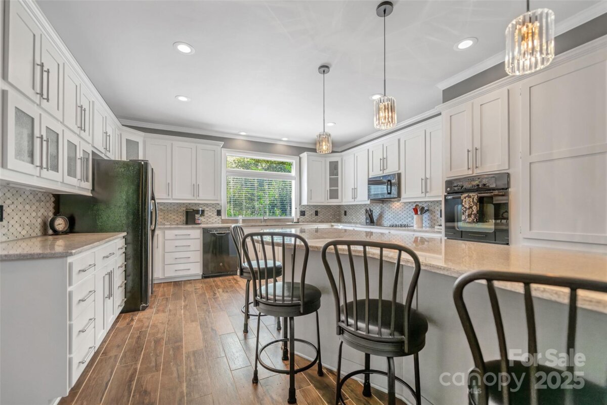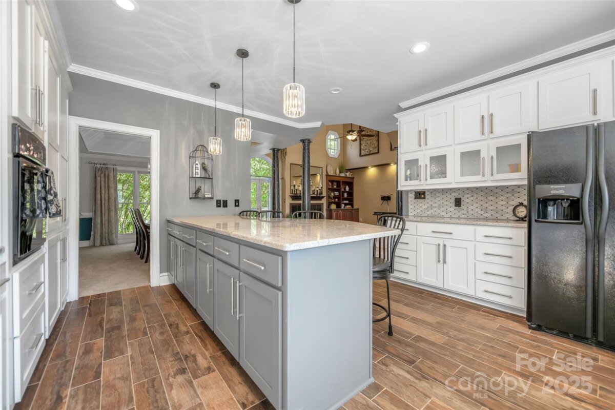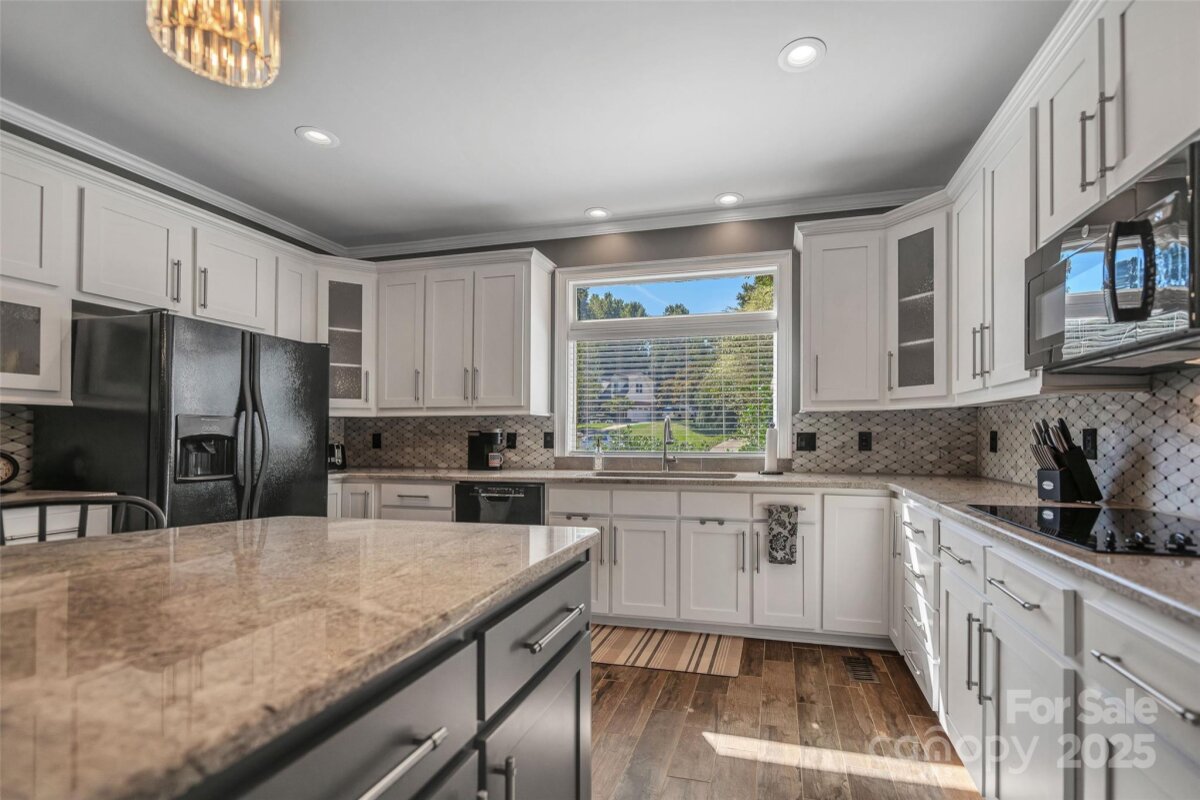 Welcome to 2769 Independence Way, an extraordinary residence tucked away in a quiet, private cul-de-sac, offering both serenity and convenience with quick access to I-85 for an easy commute. This spacious home has been thoughtfully updated and beautifully maintained, blending timeless design with modern features that make it truly one-of-a-kind. The main level centers around the stunning kitchen, fully updated in 2022 with new cabinetry, granite countertops, a custom hand-cut backsplash, frosted glass cabinet details, and new lighting. Durable wood-look ceramic tile flooring flows through the kitchen, foyer, and bath, while the dining room and owner’s suite showcase custom-designed and painted trey ceilings by local artist Denise Price Thomas. The living room is enhanced with custom cabinetry and full granite accents, while the primary suite offers a spa-like retreat with a beautifully renovated bathroom featuring custom cabinetry by Flat Rock Cabinetry, marble tub and shower walls, new flooring, updated sinks and faucets, and a swinging privacy door. Additional upgrades include remote-controlled upper foyer blinds and a high-security Pella front door installed approximately five years ago. The fully finished walk-out basement provides remarkable versatility with a fifth bedroom, a third full bathroom updated in 2025, and a second family room. A small kitchenette with granite and cabinetry makes the space ideal for guests, in-laws, or even independent living quarters. The lower level also features a custom stacked-stone fireplace, a media room with custom window treatments, detailed tile work at the base of the stairs, and Phantom retractable screens on doors leading to the lower patio. A custom workshop and hobby room off the main garage expands the home’s functionality even further. Garage and workshop space are truly exceptional. In addition to the oversized attached garage with a workshop, the property offers a detached garage built in 2009, custom-matched brick, and a full electrical service capable of powering a welder or charging a hybrid vehicle. This garage includes extra-thick concrete flooring to accommodate a vehicle lift, fluorescent lighting, a floored attic with pull-down stairs, exterior LED lighting, and a side concrete ramp that allows motorcycles to be loaded without moving cars. Altogether, the property offers parking for up to eight vehicles, as well as additional parking alongside the detached garage with shore power for an RV, boat, or trailer. The outdoor living spaces are equally impressive. In 2023, the deck was completely renovated by Fun Outdoor Living of Charlotte, incorporating Timbertech grade-2 decking with a hidden fastening system for a sleek finish, oversized supports, and new wood decking. Phantom screens on the upper-level deck doors expand your ability to enjoy fresh air comfortably. The exterior also includes a decorative paver block wall completed approximately six years ago, full decorative curbing along the top lawn and driveway, and rubber mulch surrounding the home to reduce maintenance and guard against insects. Steel entry doors with impact-resistant glass further enhance security and durability. This home represents a rare opportunity to own a property that combines fine craftsmanship, extensive upgrades, versatile living spaces, and unmatched garage and workshop facilities.... on a lot that is oversized with over an acre of land and adjacent to greenspace for privacy and serenity. Whether entertaining on the renovated deck, hosting family in the finished basement suite, or pursuing projects in the custom garages, this residence offers the perfect balance of comfort, functionality, and long-lasting quality.
