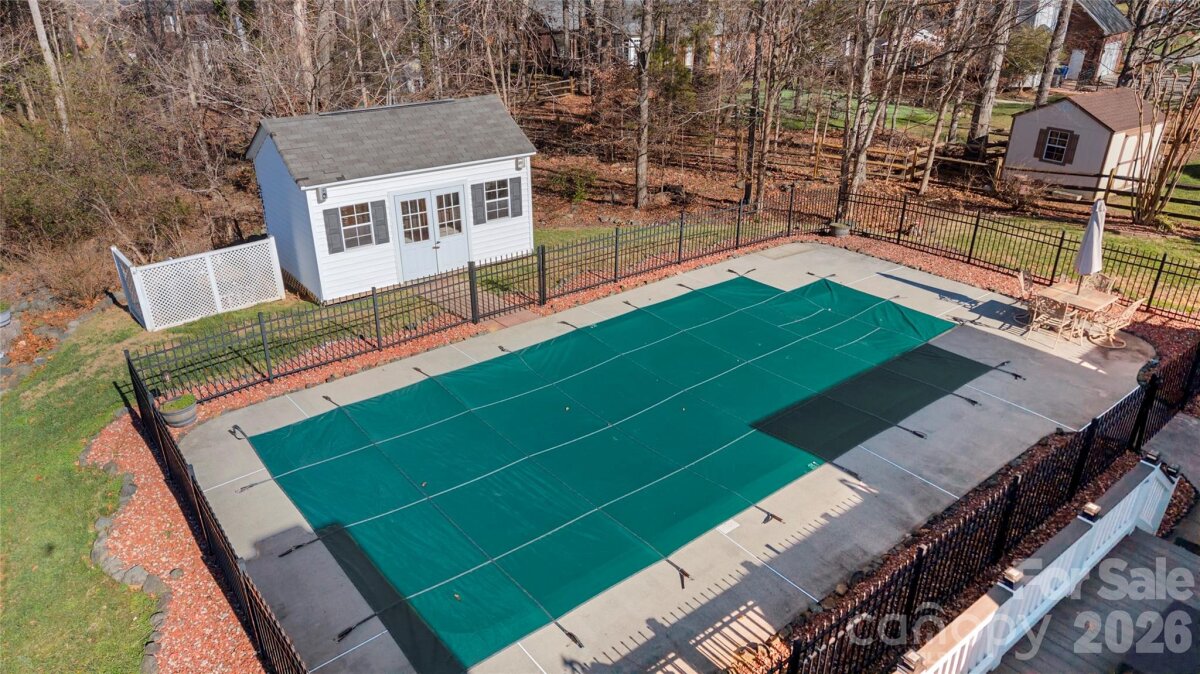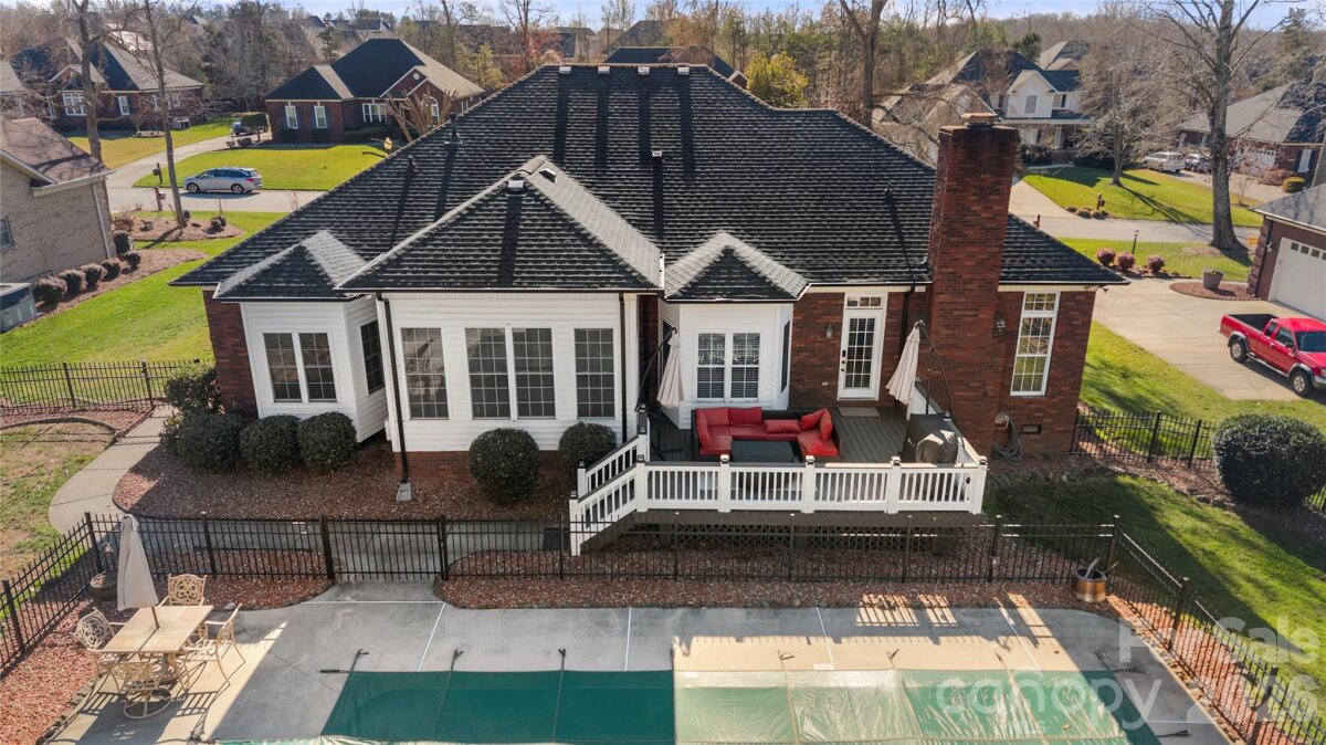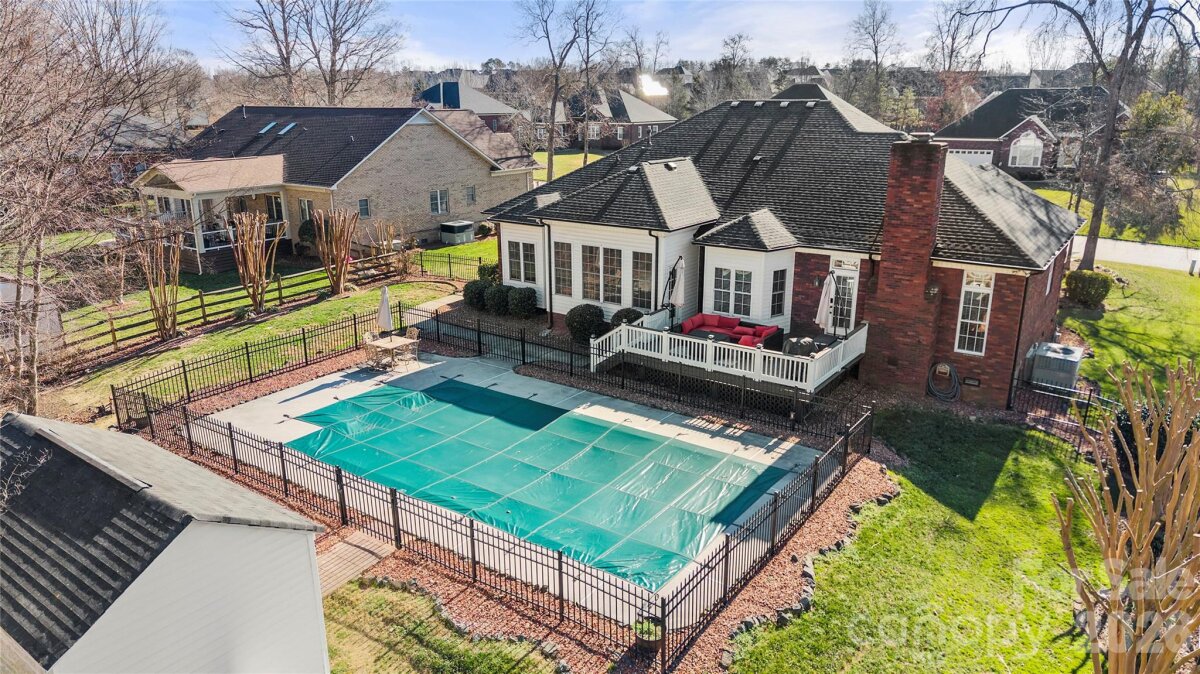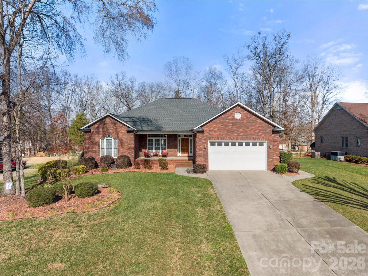 Absolutely stunning full brick 3-bedroom, 2.5-bath RANCH located in the highly sought after Clare Haven neighborhood! This home welcomes you with elegant crown molding, which adds timeless character. Seamless hardwood floors flow throughout entire home, with tile in the bathrooms, laundry room and sunroom. No carpet! Home is on 0.57 acre lot with a large back deck that overlooks a fenced in back yard with a generous sized salt water pool. Kitchen has stainless steel appliances, granite countertops and the refrigerator conveys! Home is complete with a separate study/home office overlooking the sunroom, a dedicated laundry room and 1/2 bathroom. Two Tesla electric car chargers (80Amp & 50Amp) convey and home has newer HVAC (2022). Pool building/shed located in the back yard to convey! Enjoy this home located in Harrisburg, NC which offers highly rated public schools, a small town feel, and is conveniently located to I-485 and I-85 for easy access to Charlotte, NC!