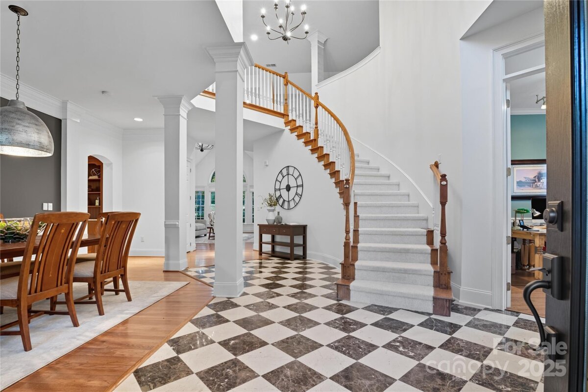 Welcome to 15915 Knox Hill Road, an elegant residence in the highly desirable "The Links" section of Birkdale. Homes in this enclave seldom come to market, and this property stands apart with its golf course setting and generous 0.48-acre lot. The approach is timeless, with mature landscaping, a secondary walkway, and a deep front porch with swing. Inside, a two-story foyer opens with checkerboard travertine floors and a graceful curved staircase. Freshly painted interiors highlight classic details: plantation shutters, deep crown molding, French doors to a private office, and a formal sitting room at the front of the home. The two-story living room is both open and inviting, with vaulted ceilings and tranquil views of the backyard, where mature trees frame the golf course beyond. The adjoining kitchen is thoughtfully designed with granite counters, center island, deep sink, and a walk-in pantry with custom wood shelving. The main-level primary suite features a bay window, ensuite bath, and spacious walk-in closet. Upstairs, you will find an open loft, a private ensuite bedroom and a pair of jack-and-jill bedrooms, each with its own sink. From one bedroom, doors open to an estate-style balcony creating an idyllic retreat. A second staircase returns you to the kitchen for an easy flow of living. Outdoors, step onto the deck to take in the views of the deep backyard, where landscaping and a garden shed styled with a faux chimney create a charming, almost secret-garden setting, with the golf course just beyond. A new roof is scheduled to be installed on October 6th, 2025, providing peace of mind for years to come. This home also includes a one-year home warranty from America’s Preferred Home Warranty for added assurance. Recent updates include a tankless water heater, encapsulated crawlspace, and established cool-season grass that remains green year-round. Life in Birkdale offers more than a home, it offers community. Amenities include a pool, clubhouse, tennis/pickleball and basketball courts, playgrounds, and year-round events, all with convenient access to Birkdale Village and Uptown Charlotte. This residence in The Links at Birkdale brings together elegance, comfort, and setting on nearly half an acre. A rare opportunity, waiting to be experienced.