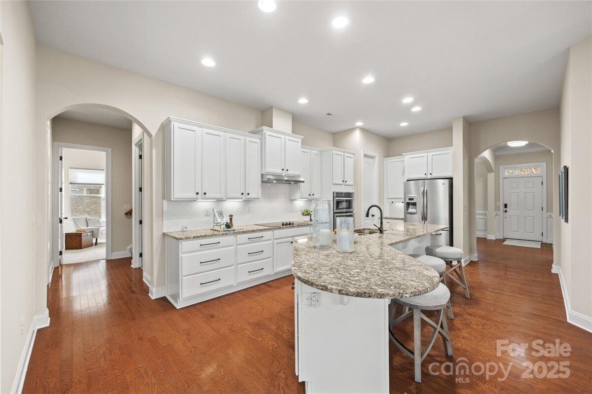 From the moment you pull up, this brick and stone beauty feels like home. Sitting on a spacious .3-acre lot with a three-car garage, the curb appeal is undeniable—but it’s the welcoming arches, volume ceilings, and easy flow inside that truly set the tone. Designed with mostly one-level living in mind, the home feels open, light-filled, and effortlessly comfortable. The heart of the home is the kitchen—a place where everyone naturally gathers. A large island anchors the space, surrounded by freshly painted cabinets, granite countertops, stainless steel appliances, a walk-in pantry, and a beautiful herringbone subway tile backsplash. It opens seamlessly to the dining area and great room, where newly added hardwood floors and updated light fixtures create a warm, modern feel that’s perfect for everyday living or hosting friends. Just off the living area, step onto the screened-in porch and take in the peaceful view of trees behind the home—your own private retreat. Two outdoor patios offer plenty of space for grilling & dining. The main level offers thoughtful flexibility with a front flex space, two generously sized secondary bedrooms, and a spacious primary suite w/ trey ceiling is tucked away for privacy. The primary bath feels like a spa escape with dual sinks, a tiled shower, soaking tub, and a large walk-in closet. If you work from home, you’ll appreciate the private office quietly positioned at the back of the house. A convenient mudroom off the garage keeps everything organized and clutter-free. Upstairs, you’ll find a large bonus room with a closet, a fourth bedroom, and a full bath—ideal for guests, hobbies, or movie nights—plus walk-in attic storage for all the extras. And the location? It checks every box. Located in sought-after Barber Rock with fabulous community amenities, you’ll enjoy South Carolina’s low taxes while being just minutes from the shopping, dining, and conveniences of Ballantyne. This is the kind of home where life unfolds easily—and where memories are waiting to be made.