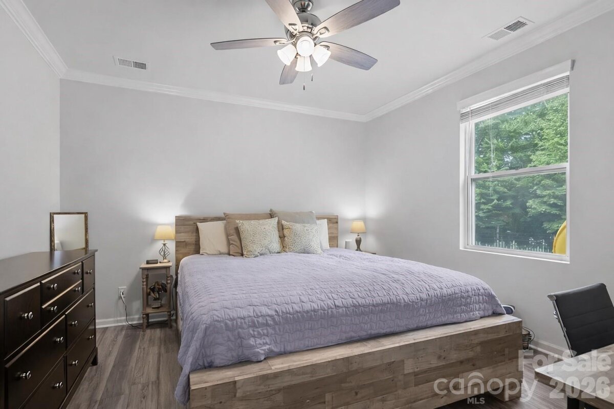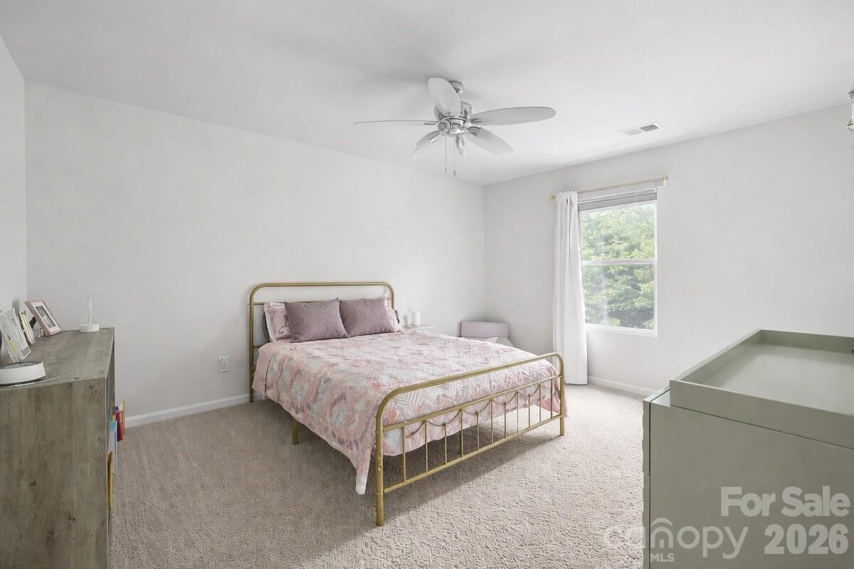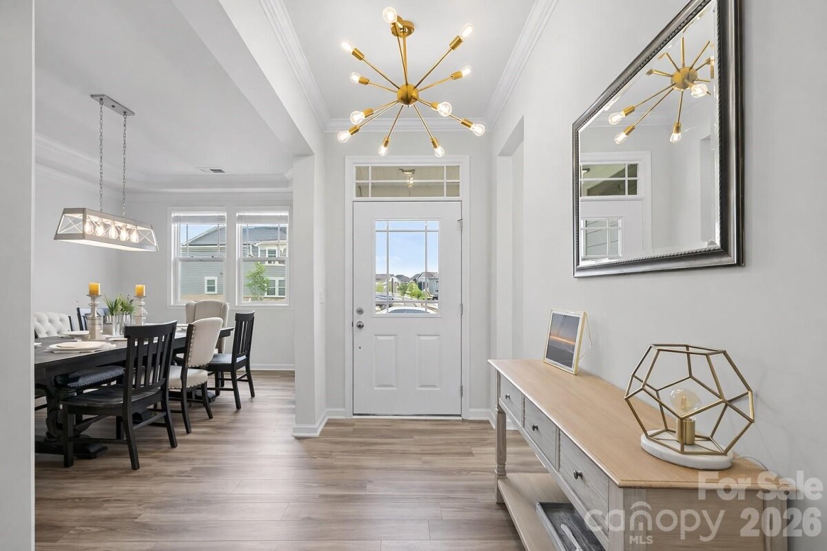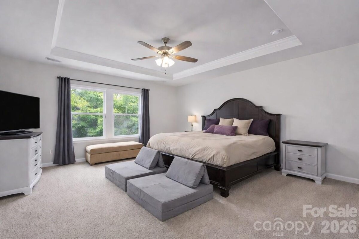 Welcome to this stunning 5-bedroom, 3.5-bath home nestled on a quiet cul-de-sac, offering direct access to scenic nature trails and exceptional community amenities. The fully fenced backyard backs to a peaceful wooded area, creating a private outdoor retreat complete with a spacious covered porch, extended patio, and relaxing hot tub—perfect for entertaining or unwinding. Step inside to an inviting open-concept floor plan designed for modern living. The gourmet kitchen is a true centerpiece, featuring a massive island with breakfast bar seating, granite countertops, and smart appliances, all overlooking the cozy family room with a gas fireplace. Additional highlights on the main level include a functional mudroom, generous drop zone, and an oversized pantry for ample storage. Downstairs, you will find a private in-law suite, including a bedroom and full bath - ideal for guests or multigenerational living. Upstairs, there is a versatile loft space that is ideal for an additional living room and/or play area. Also on the upper level is the luxurious primary suite which boasts a tray ceiling, elegant chandelier, and expansive walk-in closets. Throughout the home, you’ll appreciate refined details such as crown molding, modern lighting, updated flooring, and a whole-home air purification system. Spacious secondary bedrooms and a large laundry room with abundant storage complete the interior. Enjoy resort-style living in a vibrant community offering a pool, clubhouse, playground, sidewalks, street lights, walking trails, and volleyball court with various social activities. Located in a highly sought-after school district and just minutes from major highways including I-485, this home combines comfort, convenience, and style in one exceptional package. **Note: Roof Condition is good. It is a 30-year architectural shingle roof on year 6. **Note: HVAC system has smart thermostats. Room Info: **Main level rooms include: Family Room, Dining Room, Half Bath, Kitchen with Breakfast Nook and Island Seating, Dining Room, Drop Zone, In-Law Suite with Bedroom and Full Bath. **Upper level rooms include: Bonus Room/Loft Area, Primary Suite with Bedroom, Dual Walk-in Closets and a Spa-Like Bath, 3 Additional Bedrooms, another Full Bath, and Laundry Room.