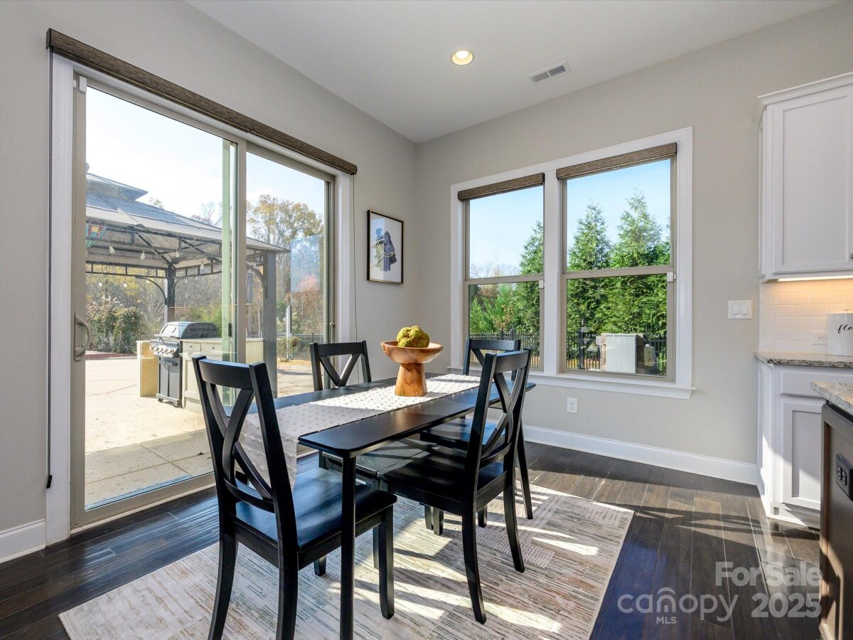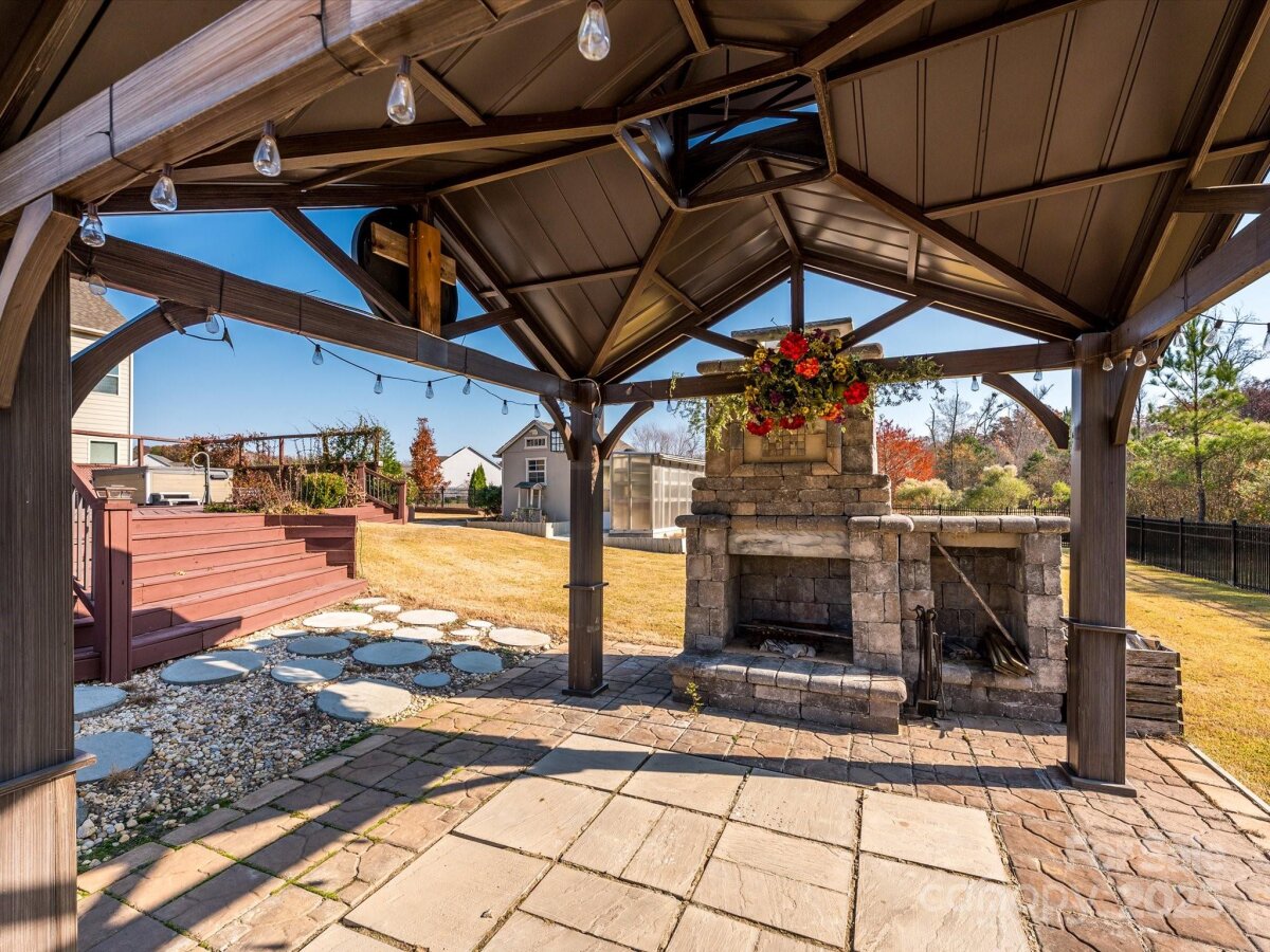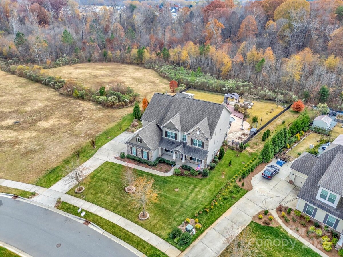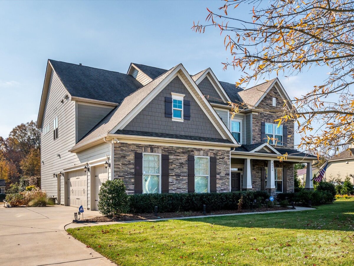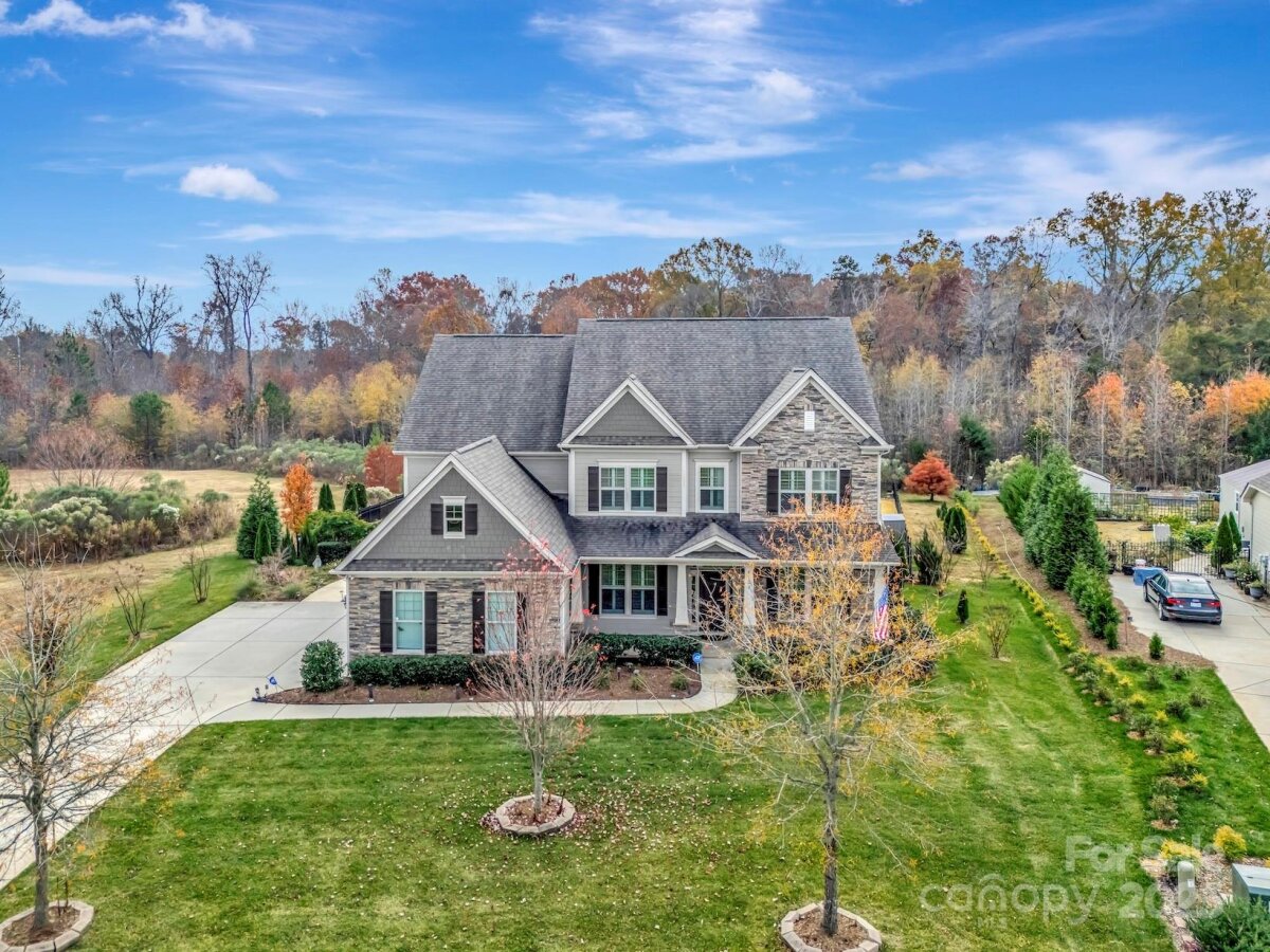 Welcome to this exceptional 2017 Bonterra-built home, where timeless elegance meets modern comfort. With striking Stackstone and cedar-style fiber cement accents, a covered front porch, and board-and-batten shutters, the exterior exudes curb appeal and invites you inside. A three-car side-load garage with pedestrian access, keypad entry, and ample hanging storage offers both convenience and style, complemented by a double-wide driveway and charming walkway to the front door with sidelights and transom. This home backs to trees and has no neighbor to the left. Step inside to discover gleaming hardwood floors throughout the main level, 10-foot ceilings, crown molding, and wainscoting, setting the tone for the sophisticated living spaces. To the left of the entry, a home office features French doors, plantation shutters, and ceiling fan with light kit—perfect for working from home. To the right, a formal dining room boasts tray ceilings, a stunning chandelier, and plantation shutters, ideal for entertaining. The great room is an inviting centerpiece with a coffered ceiling, gas-log fireplace with mantle, ceiling fan, and recessed lighting, seamlessly flowing into the gourmet kitchen. Here you’ll find 42-inch white cabinets with molding, granite countertops, subway tile backsplash, a large island, gas cooktop, wall oven and microwave, and dishwasher, along with a Butler’s pantry and spacious two-door pantry for all your culinary needs. A breakfast nook bathed in natural light completes this chef-ready space. The main floor guest suite provides privacy and comfort with a walk-in closet, en suite bath with walk-in shower, gentleman-height granite vanity, and tile flooring. A thoughtfully designed mudroom features a stainless steel utility sink, 18-inch tile, and built-in storage, conveniently located off the garage. Upstairs, wood treads with a carpet runner lead to a series of spacious bedrooms, including a Jack and Jill bath with dual sinks and tile surround. The bonus room with vaulted ceiling and ceiling fan overlooks the backyard, providing a versatile space for recreation or relaxation. The luxurious owner suite is a private retreat with vaulted ceilings, large windows, spa-inspired bath with garden tub, seamless glass walk-in shower, dual vanities, water closet, and an expansive walk-in closet with organizers. The backyard is a serene oasis designed for entertainment and relaxation, featuring a saline pool with PebbleTec finish, hot tub (sold as-is with no known issues), patio with a pergola and built-in grilling area, deck with seating areas, outdoor fireplace, built-in fire pit, pavilion, greenhouse, raised garden beds, and outbuilding. With solar energy, this home combines eco-friendly efficiency with upscale living. This has been a non-smoking household.