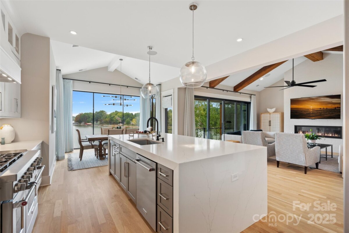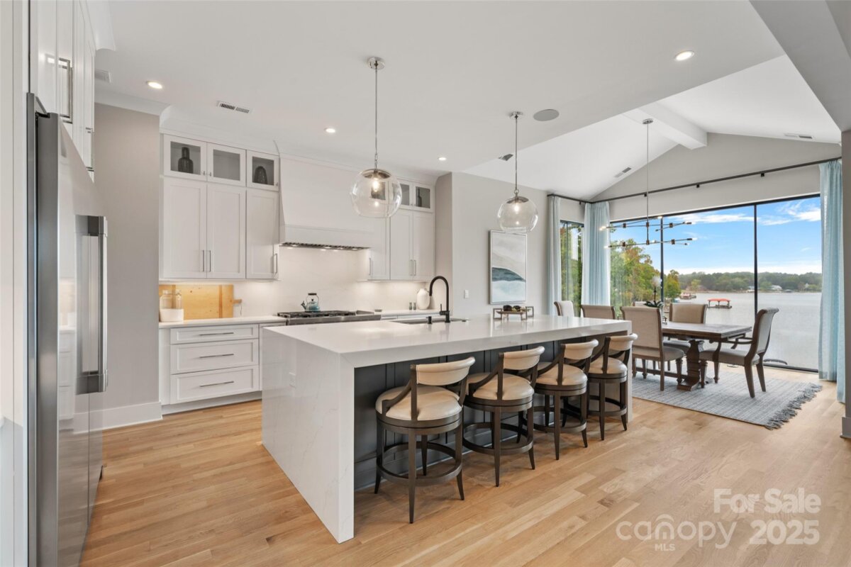 Stunning Custom Ranch with Basement on Waterfront Lot — No HOA! This custom-built home offers exceptional craftsmanship and thoughtful design throughout. Enjoy lake living with your own private dock and the freedom of no HOA restrictions. The main level features an open floor plan ideal for entertaining, showcasing a gourmet kitchen with custom cabinetry, quartz countertops, and top-of-the-line appliances including a 48" smart commercial-style gas range with 6 burners, electric griddle, true convection oven, a 30" side-by-side refrigerator, and a 30" side-by-side freezer. The spacious primary suite includes a luxurious bath and an oversized walk-in closet, along with a secondary bedroom conveniently located on the main level. Step out to the covered back deck overlooking the water — the perfect spot for morning coffee or evening sunsets. The lower level offers even more space with two additional bedrooms, multiple flex rooms, a large great room, and a full bar area complete with refrigerator, sink, and quartz countertops — ideal for hosting and entertaining. A total of four garage spaces — a three-car garage plus an additional side-entry one-car garage — provide ample room for vehicles, storage, or car enthusiasts. Every detail has been carefully curated by a professional designer with selections that are truly too numerous to list. This home blends elegance, functionality, and comfort in a serene waterfront setting.