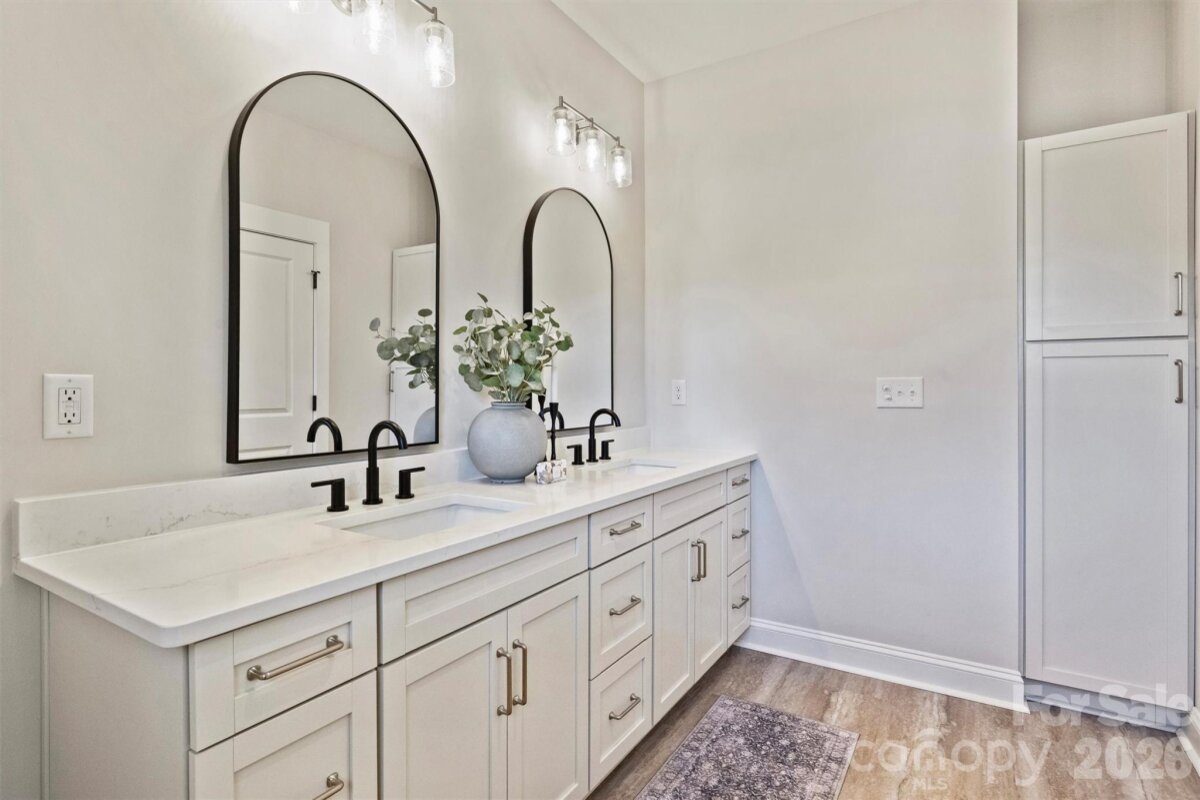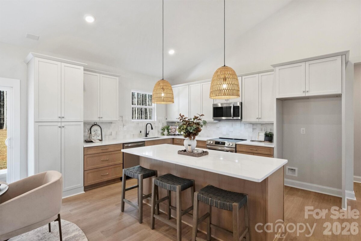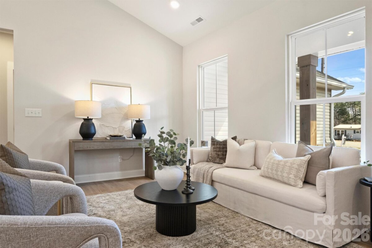 Recently completed and now fully revealed, 2307 Lee Lawing Road offers effortless living, elevated design, and the peaceful privacy of tree-lined homesites—just 15 minutes from downtown Lincolnton and convenient to Sherrills Ford and Denver. The exterior welcomes you with charming brick accents and stained wood front-porch columns, setting a warm and inviting tone. Inside, the builder’s Earthy Designer Package blends natural elements with warm tones, featuring upgraded lighting, high-end two-toned cabinetry, and quartz countertops throughout. The open-concept kitchen is centered around a generous island with pendant lighting and flows seamlessly into the vaulted main living area, creating an airy, spacious environment ideal for both everyday living and entertaining. The primary suite offers a beautifully tiled shower and designer finishes that balance comfort and style. Additional highlights include a dedicated laundry room with cabinetry and quartz counters, added recessed lighting, curated designer paint selections with crisp white ceilings, and an extended two-car garage with exterior exit door plus additional driveway parking. Now that construction is complete, this home is part of a newly released collection on Lee Lawing Road—offering a rare opportunity to own new construction with modern finishes and natural privacy in a growing Lincolnton location.