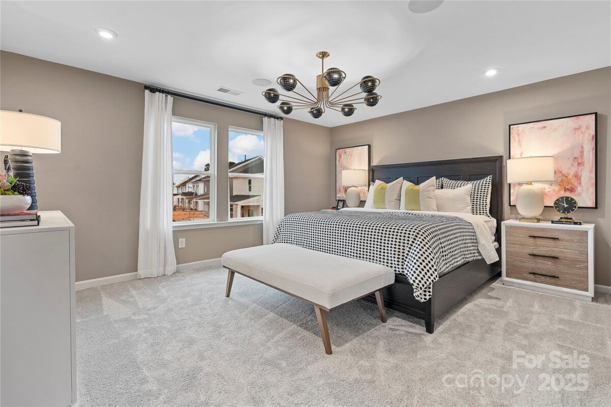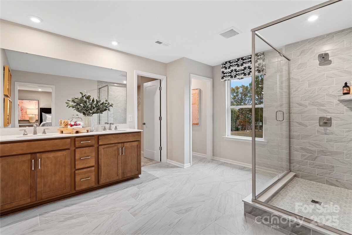 Modern yet classic, this Henderson plan checks all the boxes of a perfect home. With walkability to shops, restaurants, and daily essentials tucked inside a charming community, you’ll love coming home. The first floor, drenched in natural light, features a gas fireplace, sliding glass doors, a gourmet kitchen, and covered outdoor living. The open rail opens up the space and creates an uninterrupted flow where more awaits upstairs. Oak box wood-look stairs for added durability and premium feel. Gourmet kitchen with direct vent, crisp white cabinetry, cream backsplash, quartz countertops, and brushed nickel hardware. Gas Fireplace in the Living Room Sliding glass doors leading to 12' x 8' covered outdoor living. Double vanity at secondary bathroom. Tray ceiling at Primary suite with en suite bath and large walk-in closet.