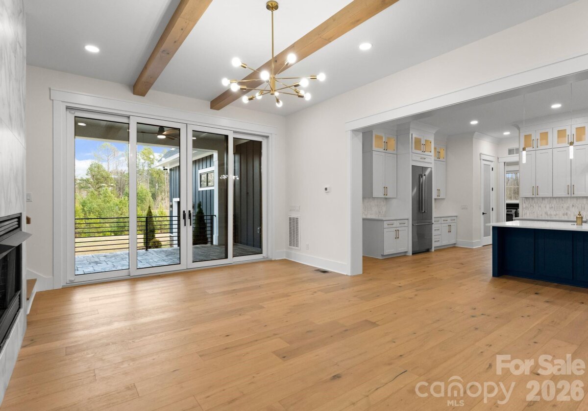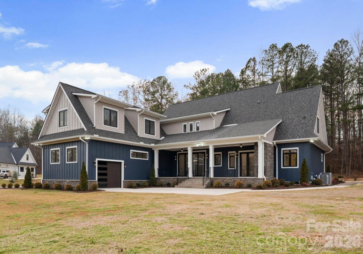 Set behind gated entry on a private two-acre parcel inside the I-485 loop, this custom farmhouse delivers rare privacy without sacrificing proximity. The setting is framed by mature trees and tranquil pond views, creating a peaceful backdrop for everyday living and entertaining. A striking modern exterior is accented by imported European windows and doors, showcasing refined architectural craftsmanship throughout. Inside, wide-plank white oak floors and designer-selected lighting establish a clean, elevated aesthetic. The main level is anchored by a spacious primary retreat with direct patio access, a customizable walk-in closet, and a spa-inspired bath featuring a seamless zero-entry shower and deep soaking tub. The kitchen commands attention with quartz surfaces, Z-Line appliances, an expansive pantry, and a walk-through scullery equipped for serious hosting, including an additional oven, dishwasher, and prep sink. Purpose-built spaces enhance daily function, including a dedicated workstation, an oversized laundry and drop zone with convenient driveway access, and a secondary full bath on the main floor. The three-car garage includes a drive-through third bay and is complemented by an additional drop zone off the interior entry. Outdoor living continues on the covered rear patio with fireplace, overlooking a level backyard ideal for gatherings or future enhancements. The upper level offers three generously sized bedrooms—one with a private bath—along with multiple flex and entertainment areas complete with a kitchenette, providing space to unwind, host, or adapt to changing needs with ease.