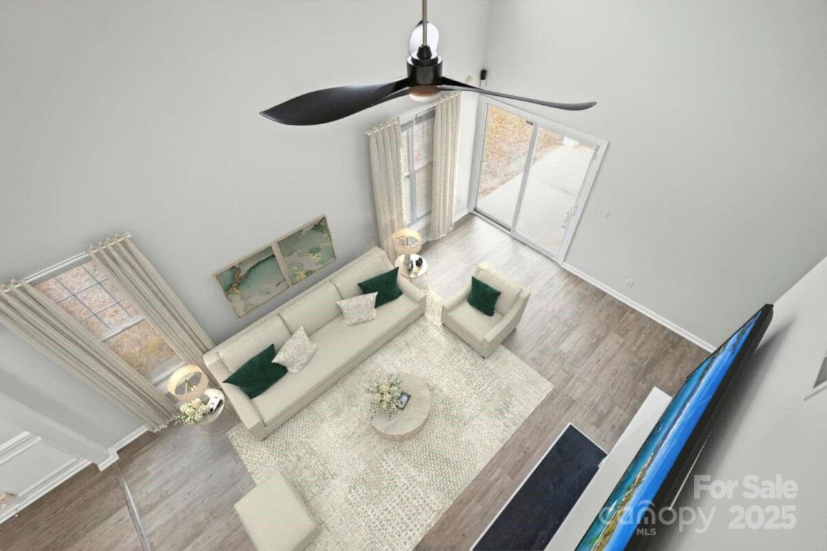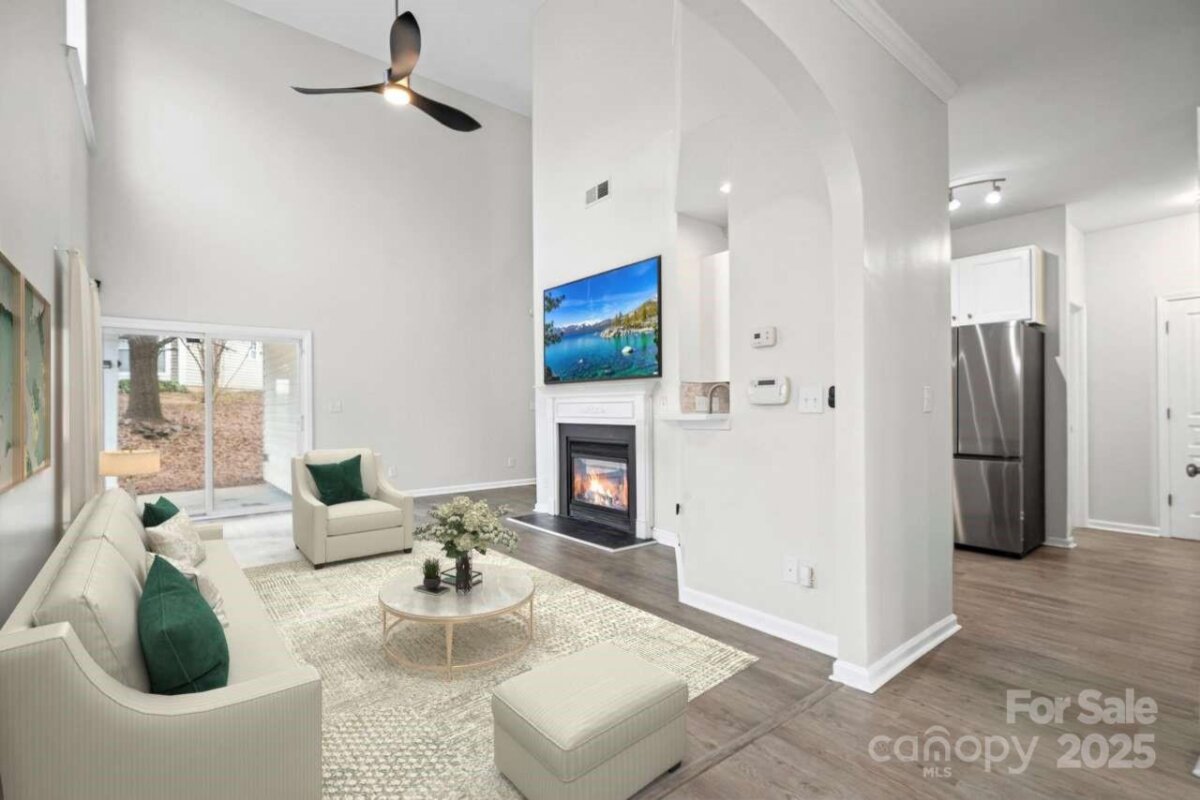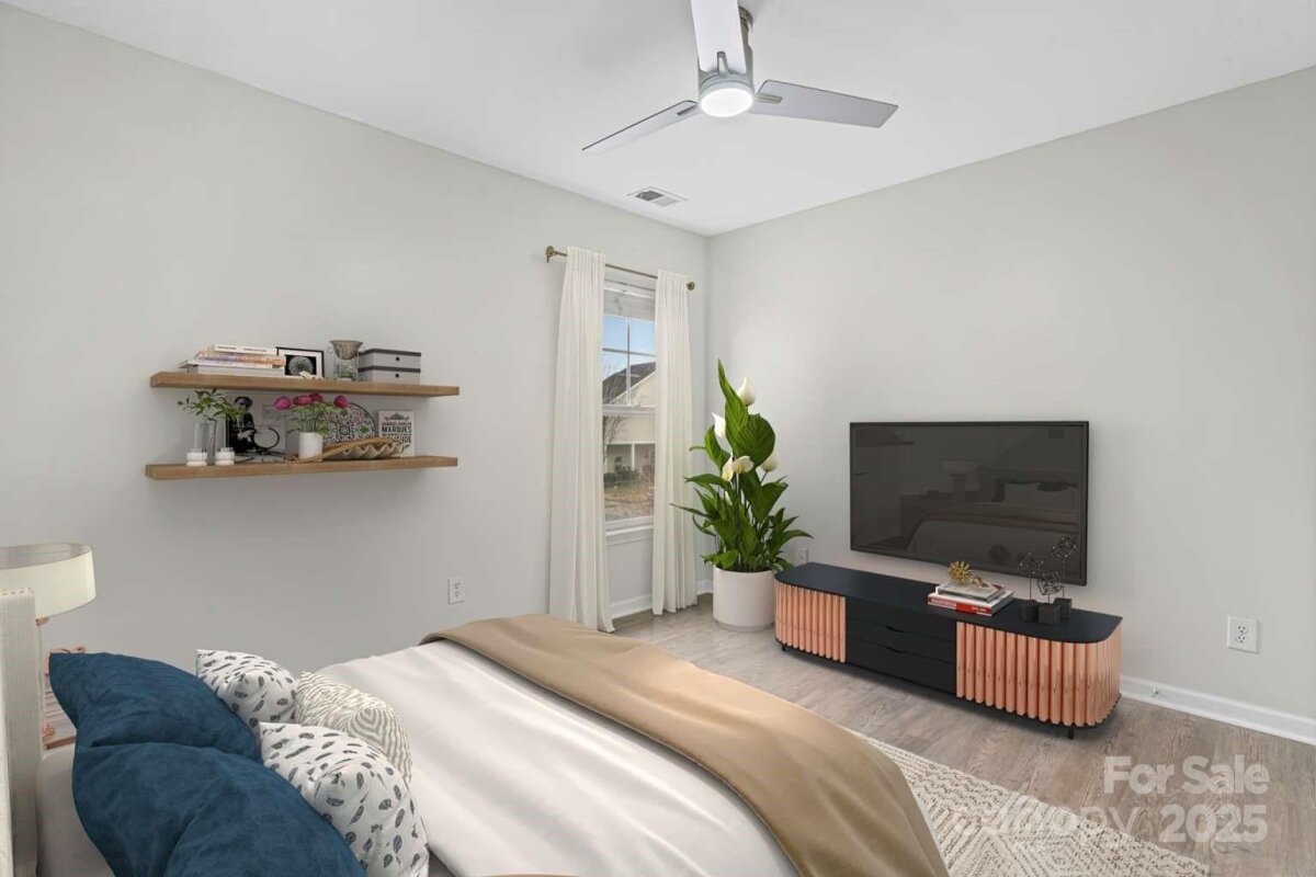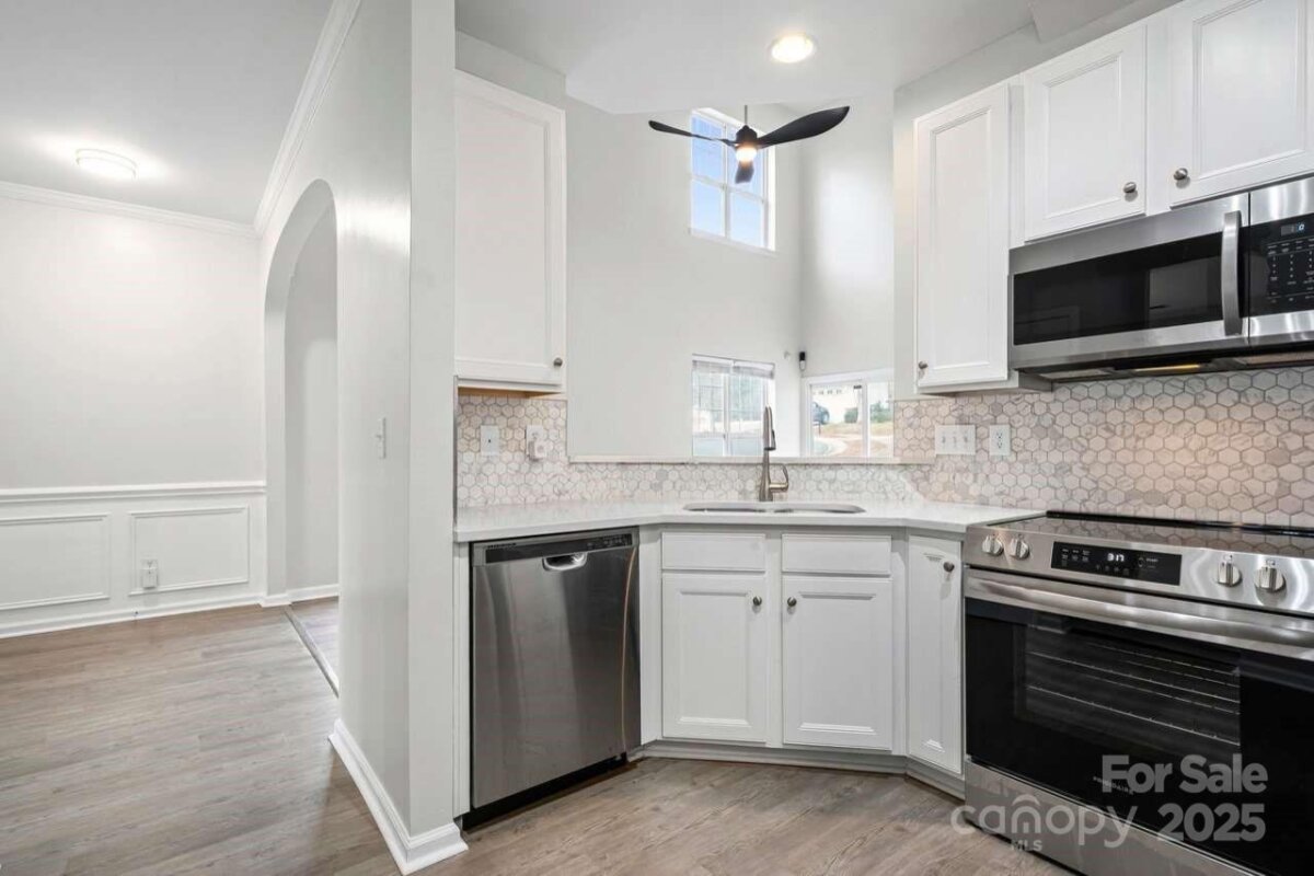 This freshly painted 3-bedroom, 2 ½ -bathroom home on a corner lot in a Cul-da-sac, with an attached garage includes a shed, LED lighting, new doors, vinyl windows and Luxury Vinyl Plank flooring throughout. The primary bedroom is located on the 1st floor, the guest 1/2 bathroom is also located on the 1st floor. Upstairs is a loft/flex space joins two secondary bedrooms, ideal for an office, playroom, or media area. The Kitchen has Calcutta quartz counter tops, tiled backsplash. All new stainless-steel appliances are included (refrigerator, stove, microwave, and dishwasher). Bathrooms have rain shower heads and quartz vanities. Living room and Bedrooms have remote control ceiling fans. The HVAC unit was installed in 2024. Smart devices to include a smart door lock and installed Ring spotlight security camera are included. Community amenities include a pool and playground area. Home is Virtually Staged
