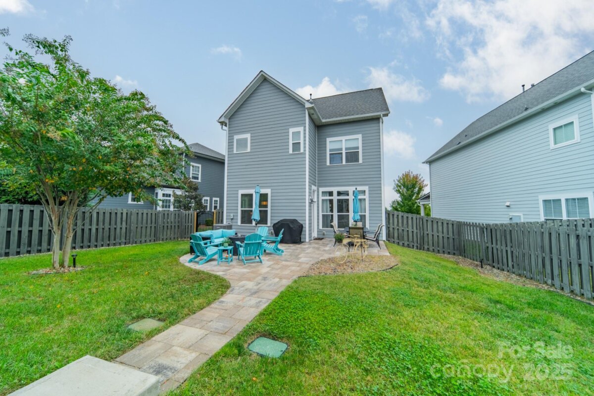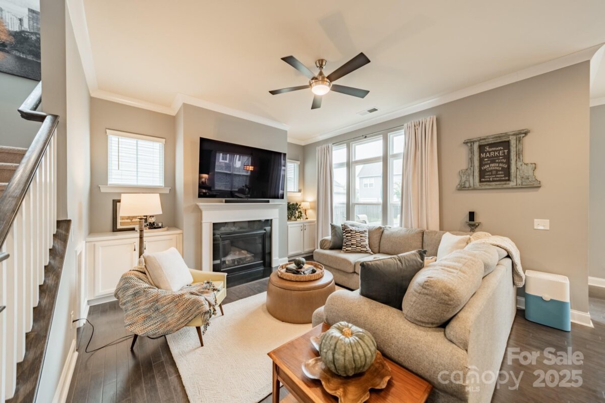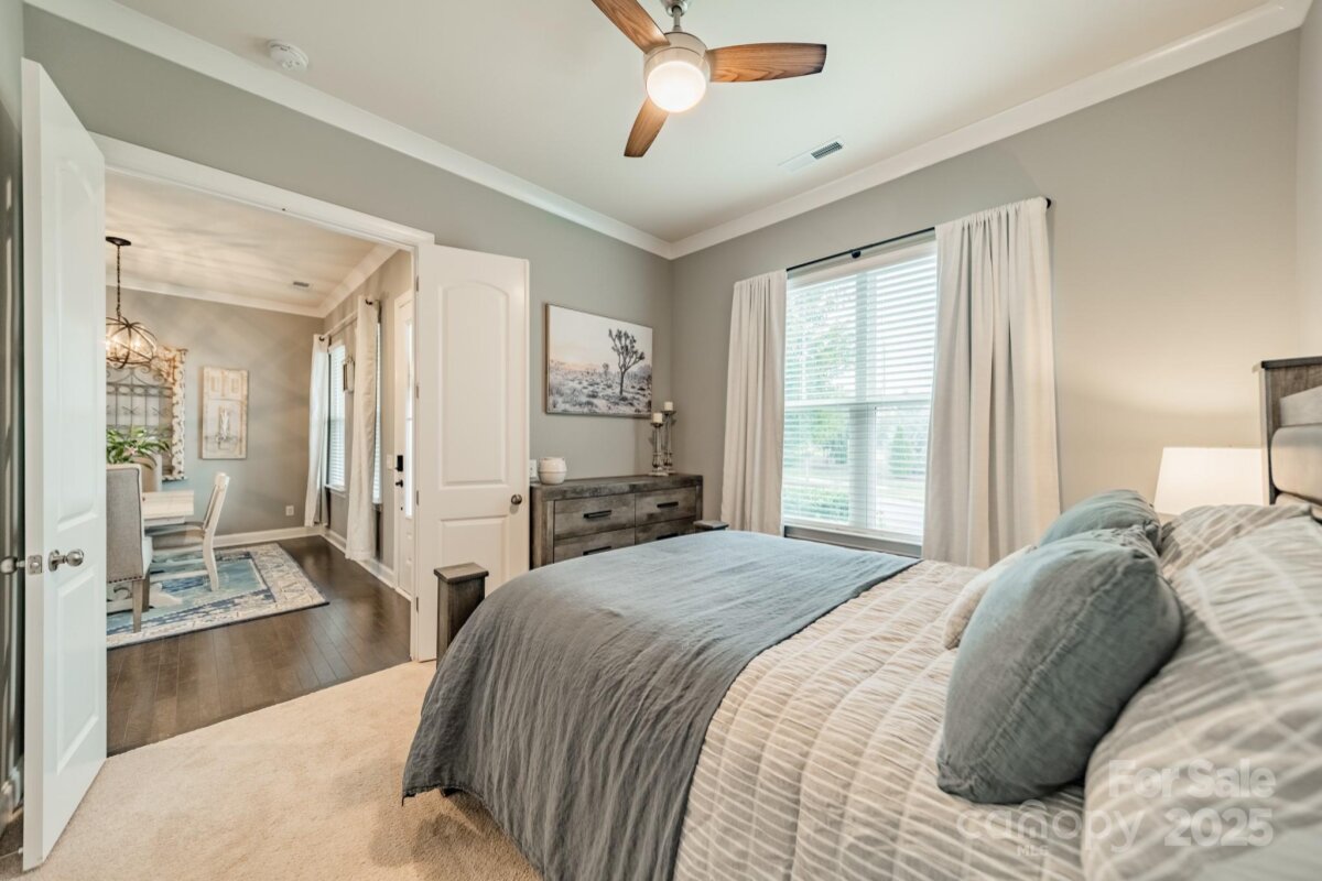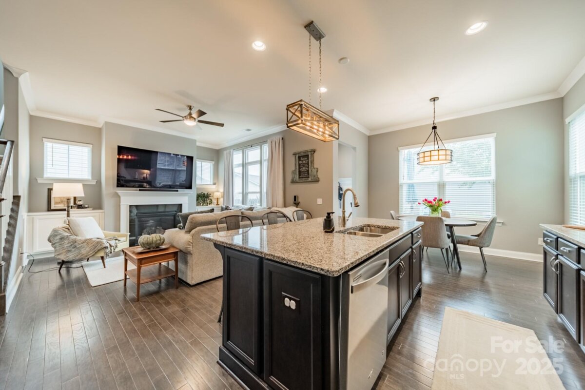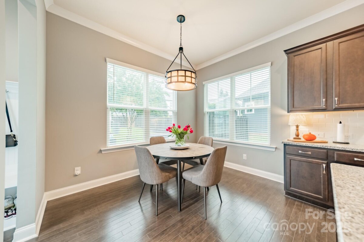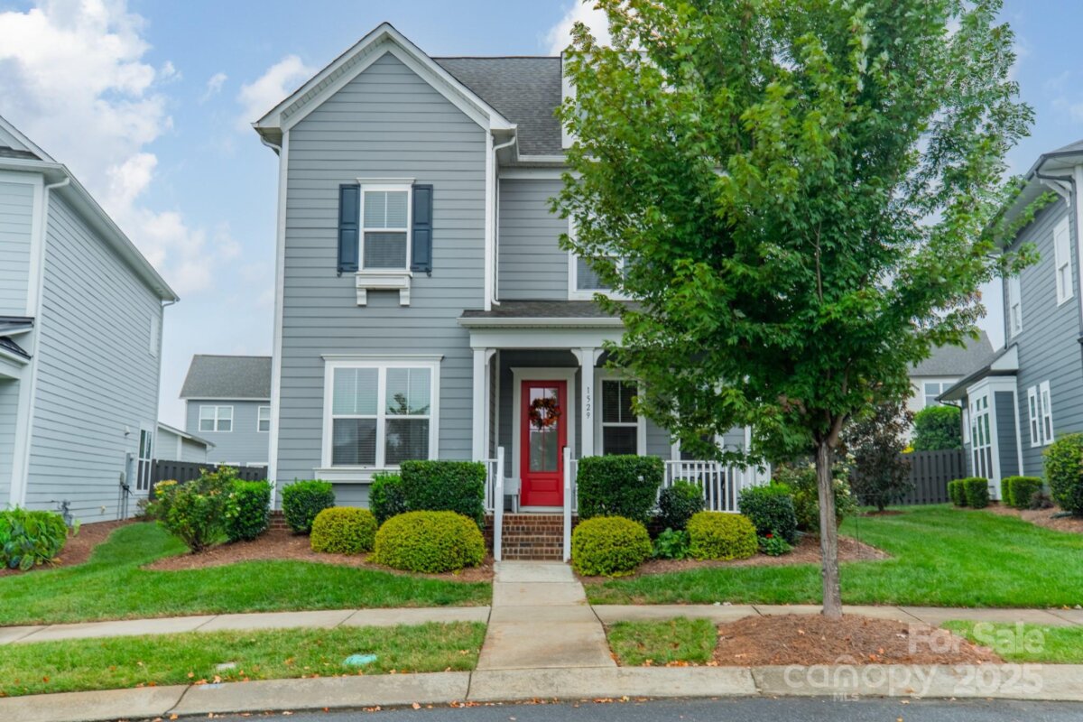 This inviting home in the highly sought-after McCullough neighborhood greets you with a spacious front porch and timeless curb appeal. Inside, the open floor plan features wood flooring, 10’ ceilings on the main level, and 9’ ceilings upstairs. A gracious foyer leads to the dining room and a main level guest suite for added convenience. The light-filled kitchen offers an island, gas cooktop, stainless steel appliances, a walk-in pantry, and a breakfast room. It opens into the great room with a fireplace and built-ins—an ideal space for everyday living and entertaining. A drop zone at the back door completes the main level. Upstairs, the luxurious primary suite features dual vanities, a soaking tub, separate shower, and a generous walk-in closet. Two additional bedrooms, a full hall bath, and a laundry room complete the second floor. Outdoors, the fenced backyard provides privacy for relaxing on the custom patio and lawn, while the HOA includes front yard maintenance for truly easy living. The McCullough community has it all—two pools, playgrounds, clubhouse, pickleball and tennis courts, dog parks, a fitness center, charming pocket parks and walking trails link the neighborhood to parts of the Greenway system. Zoned for the brand-new Ballantyne Ridge High School and just minutes from Downtown Pineville’s shopping, dining, and conveniences, this home combines comfort, community, and location in one remarkable opportunity. Come see for yourself what makes this home—and McCullough living—so special. Welcome home!