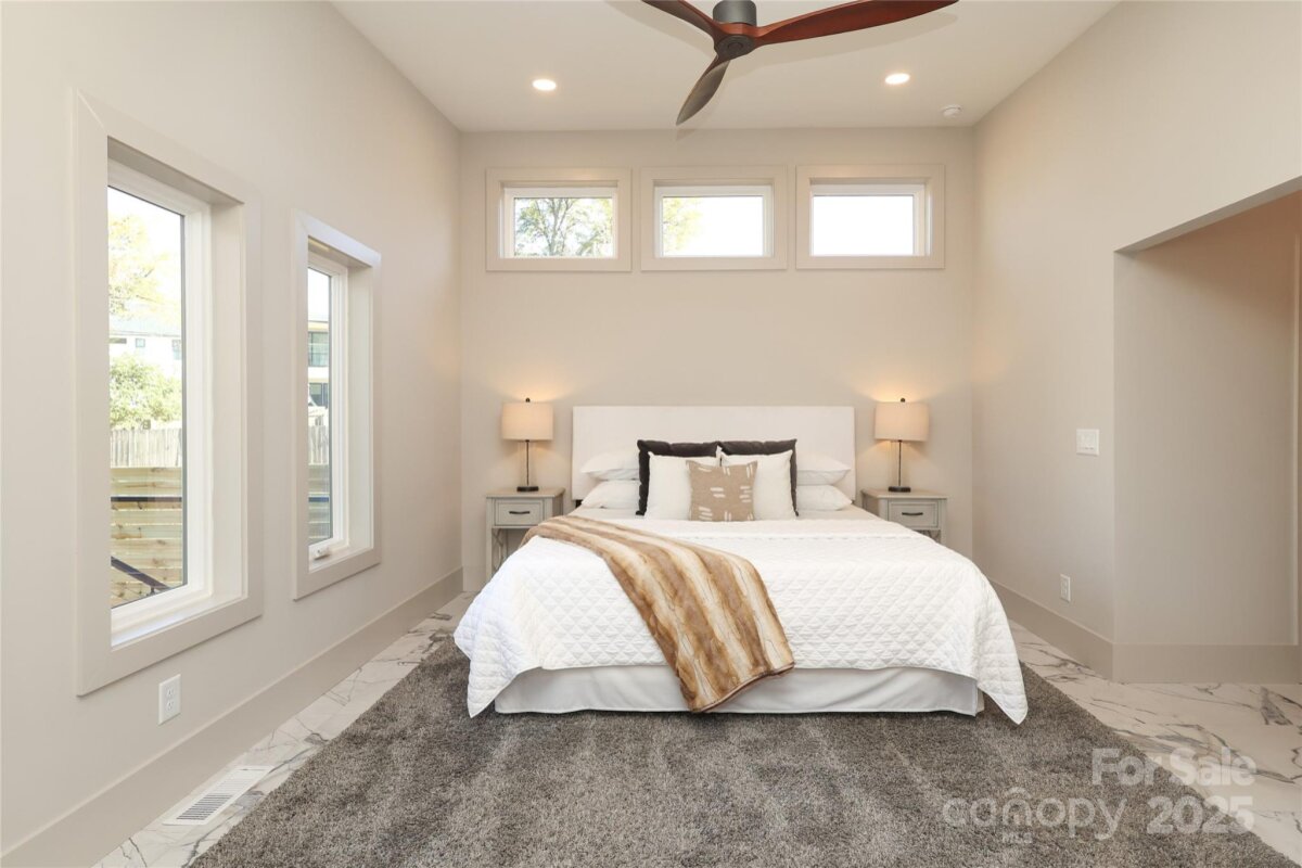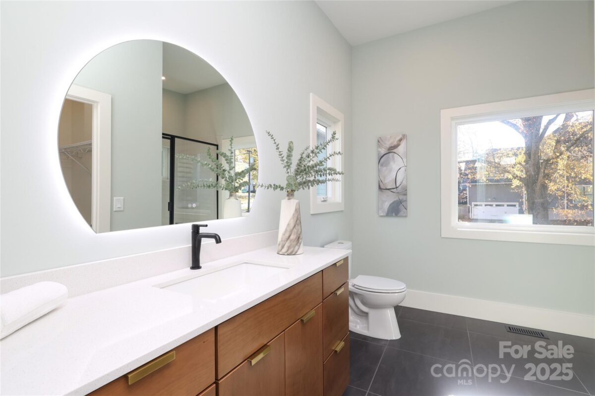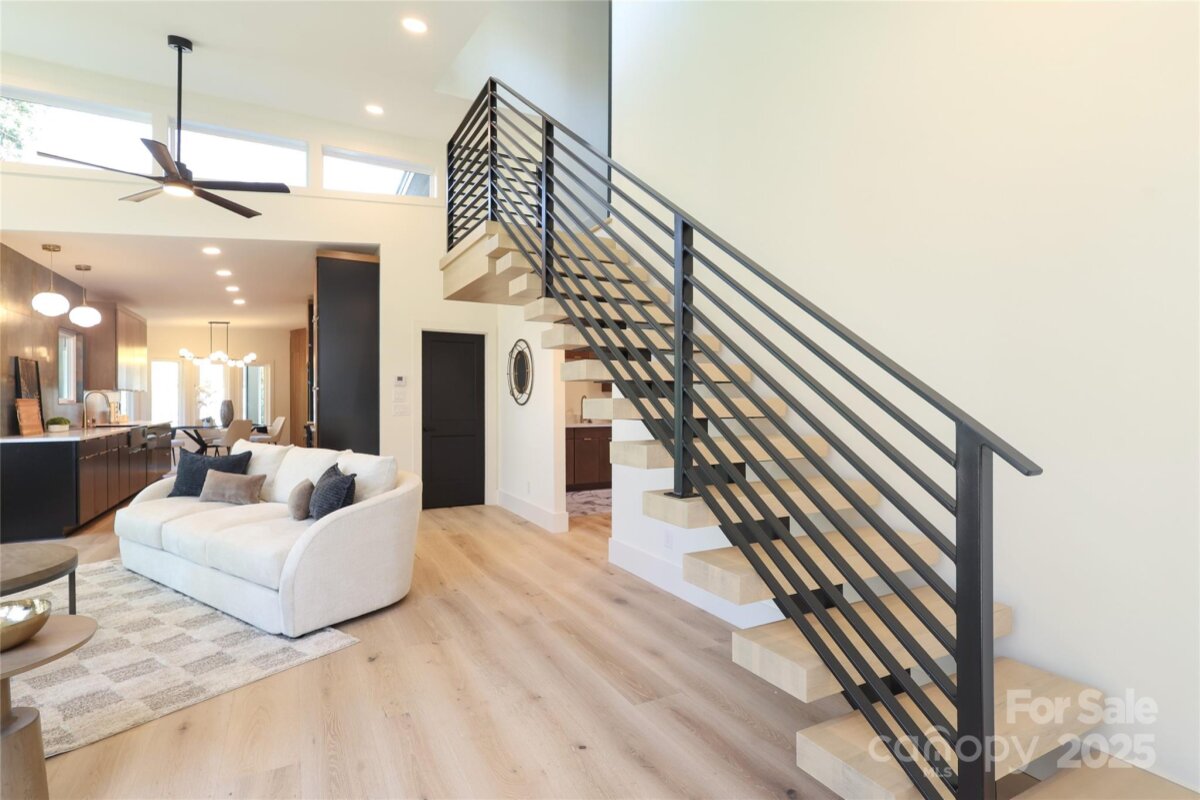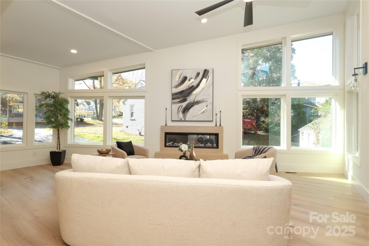 ARCHITECTURAL SANCTUARY ON THE CREEK • ULTRA-MODERN CUSTOM BUILD • VILLA HEIGHTS Discover true privacy and architectural significance in Villa Heights. Tucked back from the street alongside a year-round creek (non-flood zone), this residence offers a serene, nature-immersed experience just minutes from Uptown. The exterior makes an immediate statement with its striking "triple-roof" profile, deep overhanging soffits, standing seam metal roofing, and warm cedar accents that blend sophisticated modernism with the natural landscape. The interior is a masterclass in calm luxury. Massive windows flood the open floor plan with natural light, highlighting matte finishes and intentional sightlines. The space is anchored by a true architectural centerpiece: a custom floating staircase with powder-coated steel railings. The chef’s galley kitchen balances function and style, featuring sleek quartz surfaces, a walk-in pantry, and a premium black stainless appliance suite (beverage cooler included). The seller is offering a $5,000 allowance for a refrigerator and/or custom closet systems to complete your vision. The primary suite rivals a boutique hotel, featuring the home’s second electric fireplace and a show-stopping "Wet Room" ensuite with a zero-entry rain shower and soaking tub. Upstairs features a second full suite and a dedicated media loft, while the sun-filled front bedroom on the main level serves as an ideal home office. Outdoor living is where this property truly shines. Side and rear decks overlook the creek, providing a lush, green backdrop and the soothing sound of running water—a complete escape from city noise. Enjoy the rare luxury of a deep yard, ample off-street parking, and a location that is just steps from the Blue Line Light Rail, Cordelia Park, and the vibrant breweries of NoDa. Located less than 3 miles from Uptown Charlotte, this is the perfect blend of modern architecture and nature. Welcome home.
