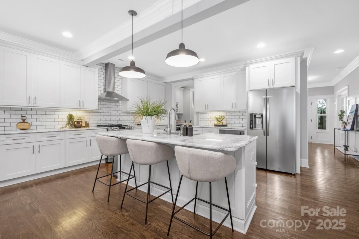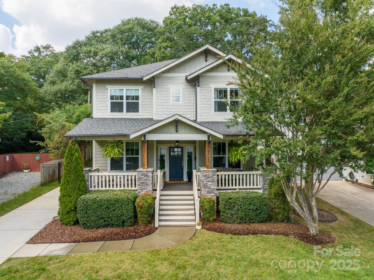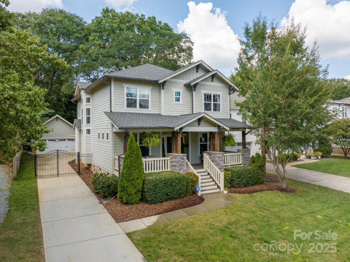 Welcome to Plaza Midwood! Built in 2016, this 4-bedroom, 3-bath Craftsman-style Colonial offers timeless charm with modern convenience and is truly move-in ready. Inside, you’ll find rich hardwood floors, coffered ceilings, crown molding, and elegant marble countertops. The chef’s kitchen boasts a spacious island with seating for three, a walk-in pantry with custom shelving, and a built-in butler’s pantry/dry bar—perfect for entertaining. A main-level guest suite / 2nd primary bedroom with a full bath provides comfort and flexibility, while upstairs you’ll discover the luxurious primary suite with a custom bath, two additional bedrooms with a shared hall bath, and a generous laundry room. The upstairs loft offers endless possibilities—as a kids playroom, home office, or game room. The dramatic open staircase connecting the two levels is a true showpiece. Outdoor living is just as impressive with a large covered front porch featuring ceiling fans and a heated, screened-in back porch for year-round enjoyment. The wooden fenced in backyard includes a custom aluminum metal decorative driveway gate leading to the Detached 2-Car Garage & backyard. Keys at close. Immediate occupancy. All of this is just a few minutes drive to both Midwood Park and NoDa, and less than a 15 minute drive to Uptown Charlotte.