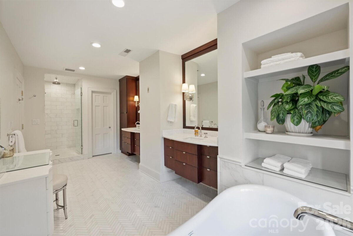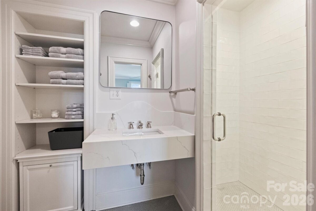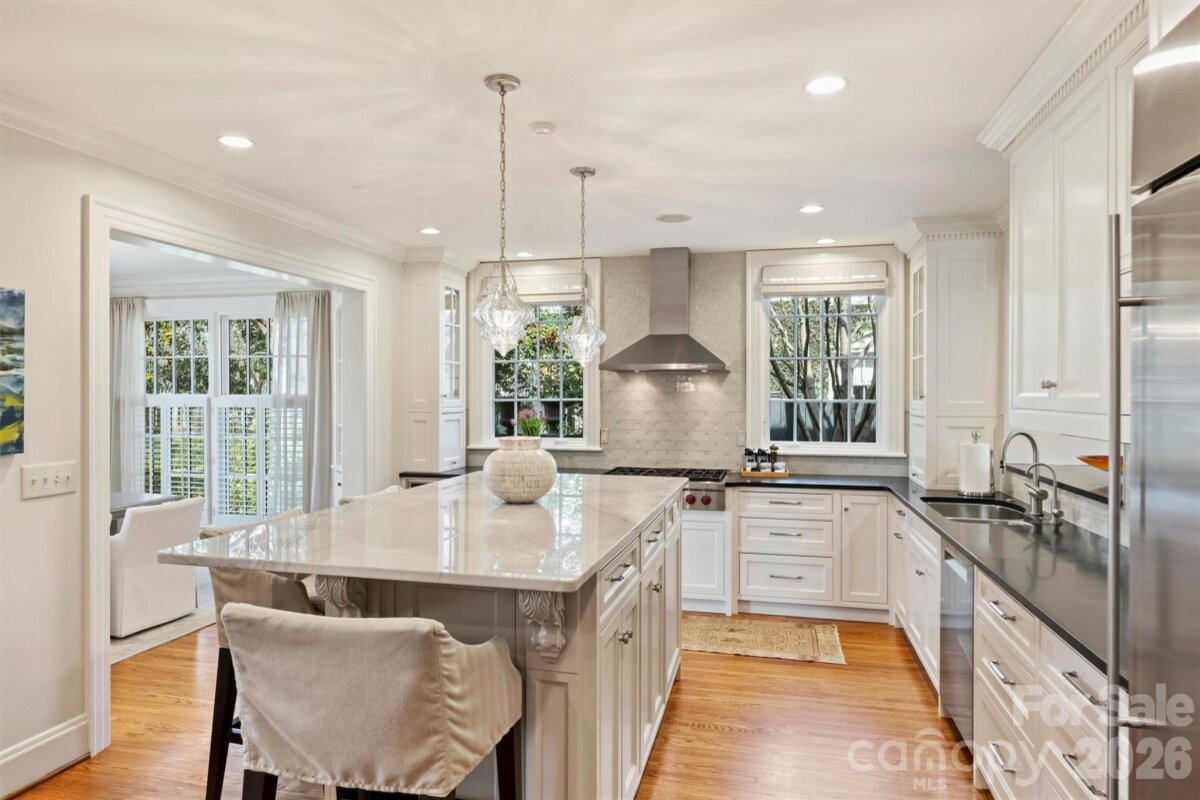 This stately, beautifully renovated residence on prestigious Queens Road West blends timeless sophistication with modern comfort. Built in 1936 by the Heath family and cherished by only two additional owners, 1555 Queens Road West reflects a rare legacy of care. A distinctive fireplace dating to the late 1800s, relocated from a Central Avenue home, adds exceptional character. A major 2003 expansion introduced the spacious breakfast room, kitchen and pantry, inviting family room, primary suite, and office. The thoughtfully designed layout offers the perfect balance of elegance and comfort—gracious formal living and dining rooms set the stage for memorable entertaining, while the cozy den and impressive family room provide relaxed spaces for everyday living. The chef-inspired, newly updated kitchen showcases stainless-steel appliances, a stylish bar with wine cooler, and a generous central island that flows seamlessly into a sunlit breakfast room. Upstairs, the private primary suite is set apart from three additional bedrooms and includes a spa-like bath renovated in 2023 and dual organized closets. Added in 2020, the garage and versatile studio with full bath, beverage center, and Murphy bed complete this exceptional property. The expansive, secluded backyard is beautifully landscaped with vibrant greenery and mature trees, offering a serene retreat with plenty of room to add a swimming pool.