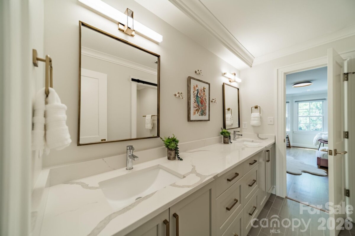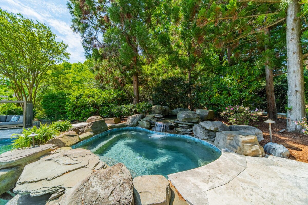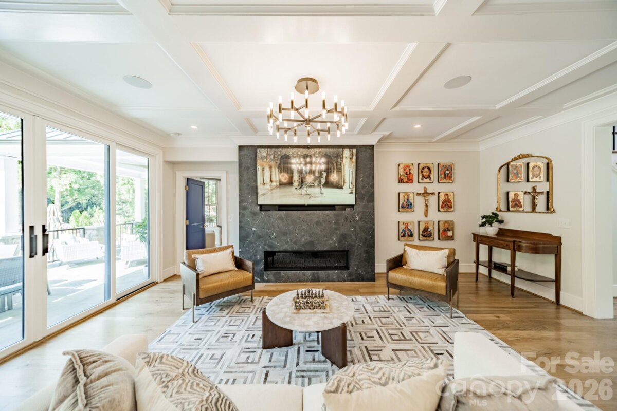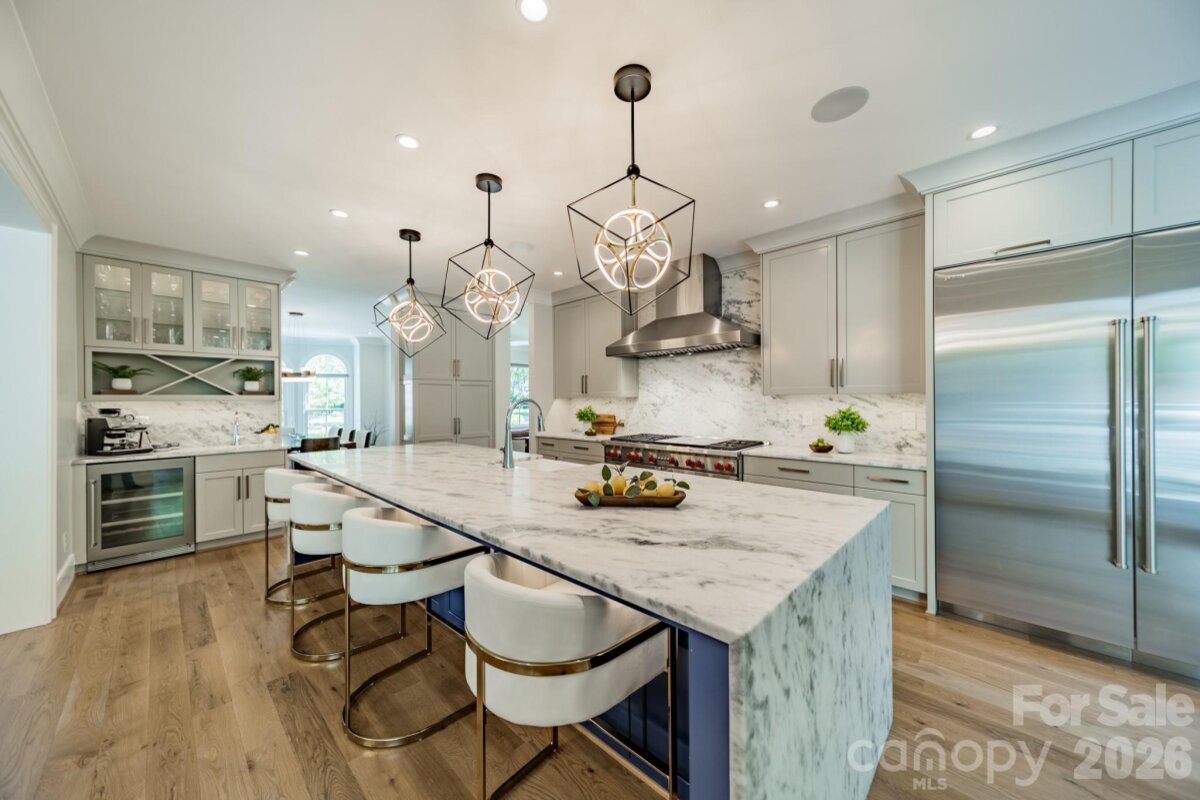Welcome to this completely reimagined SouthPark residence, where thoughtful design and elevated material selections come together to create a truly distinctive living experience. Completed between 2021 and 2022, the home reflects a comprehensive renovation that blends modern living with the character of one of Charlotte’s most established and walkable neighborhoods. Spanning more than 6,300 square feet, the home offers a seamless flow of space, where each room feels intentional and connected. Five-inch European white oak flooring extends throughout, including staircases, complemented by solid-core doors in a custom electric blue finish. Designer lighting, sourced through New York design channels, adds a curated layer of warmth and dimension. Natural stone is featured throughout as both a design element and focal point, with exotic quartzite showcased in the primary suite, main-level den and select bath and vanity spaces. The primary suite offers a private retreat with a bath finished in floor-to-ceiling Italian porcelain tile and a custom dressing room with center island. The kitchen is designed to balance performance and style, anchored by Fantasy White honed quartzite surfaces, including a waterfall island and full-height backsplash. A professional-grade appliance suite, custom cabinetry and dual laundry areas support both everyday living and entertaining. Gathering spaces throughout the home offer flexibility and comfort, including a main-level family room with Saratoga Black leathered quartzite framing the fireplace, coffered ceiling detailing and integrated audio. The third-floor entertainment level creates a dedicated media experience with a 120-inch screen, Epson projector, Apple TV integration and a HEOS multi-zone sound system. Expansive sliding doors open to a redesigned outdoor setting where bluestone terraces and an extended travertine patio frame the pool and spa. Landscape lighting, irrigation systems and raised garden beds enhance both usability and presentation, while architectural updates such as cedar shake-style siding, Belgian paver driveway accents, gas lanterns and gated entry complete the property. Located in the heart of SouthPark, this home offers a rare opportunity to enjoy a fully renovated residence with a level of design and finish more commonly found in larger metropolitan markets.