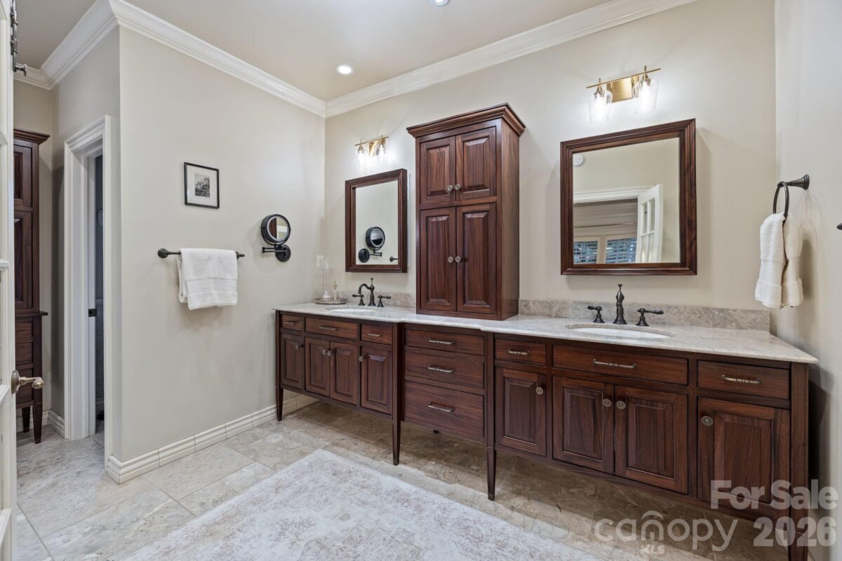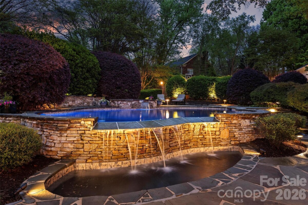 Spectacular property in Quail Hollow on over an acre. This 6 bedroom home is perfectly positioned on a quiet street with an incredible private backyard retreat. Elevate your outdoor living and entertaining with the resort like pool cabana & pool surrounded by gorgeous mature landscaping & lighting. The main level features 9ft ceilings, custom moldings & built-ins and natural light. The traditional floor plan includes formal living & dining rooms, a wood paneled office, a spacious family room with a fireplace with gas logs, a bar with an ice maker & beverage fridge. The gourmet kitchen has ss appliances & an island and is centrally located near the dining room & family room. Other amenities include a side entrance drop zone/mud room, a dedicated laundry room & a sunroom with vaulted ceiling and incredible light. The primary suite on the main level has a fireplace & walk-in closet & a spa bathroom with heated floors and steam shower. The second level includes 4 bedrooms, each with their own half bath & shared tub/showers. Third floor has great flex space and a full bathroom offering a multitude of uses - a gym, a second office or an additional bedroom. The lower level is perfect for entertaining & accesses lower level patio. The outside living includes many options. Enjoy the upper deck off of the family room & kitchen overlooking the backyard or the lower patio off of the basement. The pool & pool cabana are an absolute dream. The huge custom cabana has it all - ceiling heaters, speakers, wood burning fireplace, bar seating and an outside kitchen. The heated saltwater pool and hot tub complete the gorgeous atmosphere. There is also an outside shower & a pool bathroom with a changing area. Attached 2 car garage with an extended parking pad and a circular driveway.