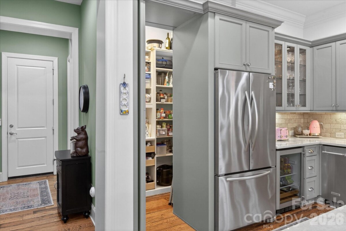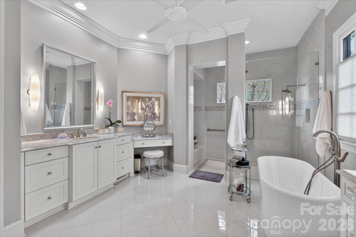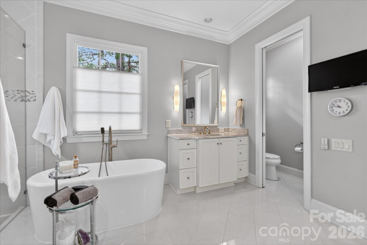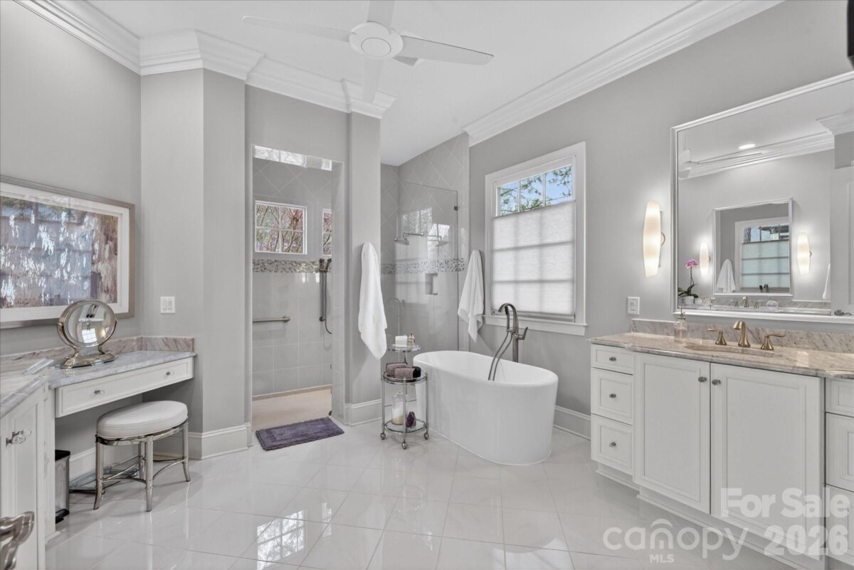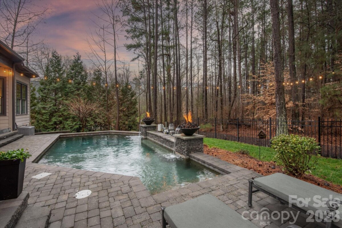 Beautiful LUXURY single story ranch home, with 3 car garage, situated on a private wooded lot backing to acres of common area in popular Hadley Park community. Hard to find floor plan with high end features such as 12'-14' ceilings, generously sized spaces, and many premium finishes. At the heart of the home, there is a large great room featuring coffered ceilings, a beautiful fireplace and a wall of windows and french doors opening to the private backyard. Kitchen features all custom cabinetry, large island with Taj Mahal quartzite top, gas cooktop with commercial hood, stainless steel appliances, a wet bar with wine fridge, and a concealed walk in pantry with custom built in storage. The primary wing includes a spacious bedroom with back porch access, double walk in closets, and a large en suite bath with separate vanities and a large zero entry shower. Additional highlights include spacious secondary bedrooms with dedicated full baths and walk in closets, a private office with French doors, a large laundry room with custom built in cabinetry, and a 900 square foot three car garage. Outside, the heated saltwater pool is complemented by a stone paver patio, fire features, and a large covered veranda at the rear of the home. Other features include whole house water filtration system and a whole house dehumidifier. Zoned for A+ plus Weddington schools, and located near popular town centers such as Rea Farms and Waverly. Experience refined living in this exceptional move in ready home.